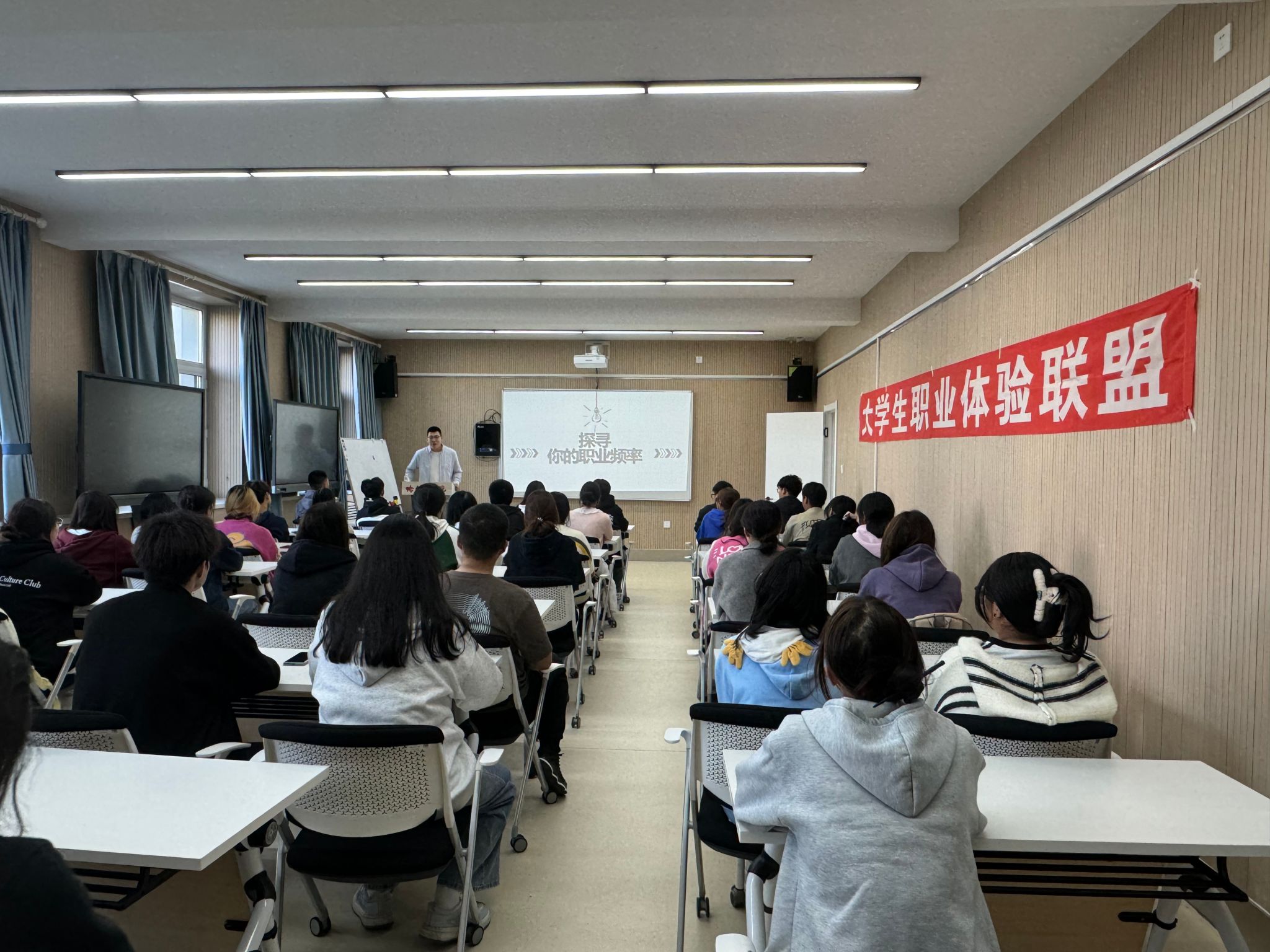(文/李一宁)赋能未来,筑梦启航。为深化学生自我认知、明确职业定位、提升就业综合素质能力,10月9日下午,校团委、就业指导处联合问前程大学生就业服务平台于1号教学楼302教室举办“探索职业生涯”就业专题讲座。本次讲座特别邀请到网才HR联盟、益行社职业指导师、职业生涯指导专家杨涛主讲,80余名学生代表聆听讲座。