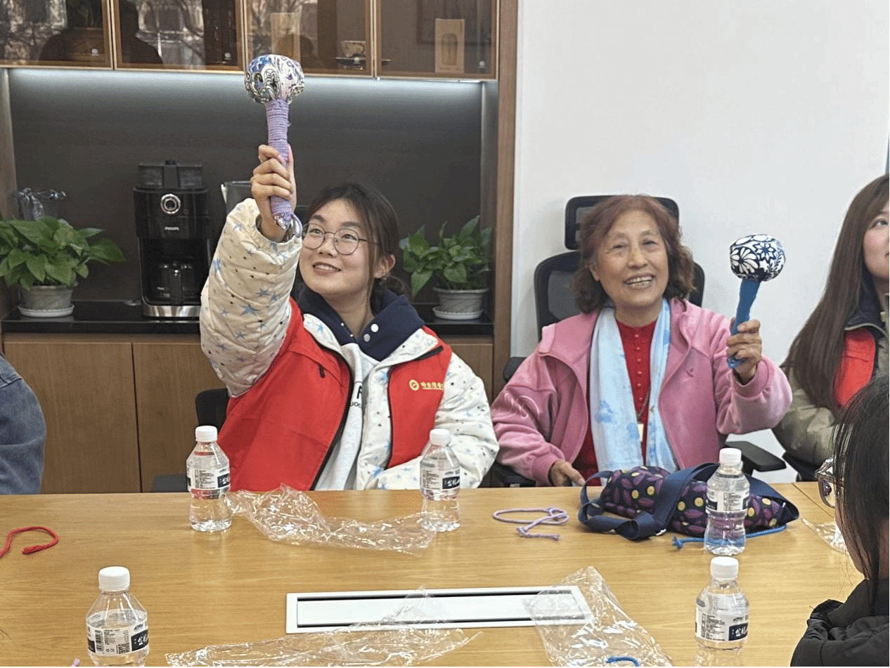 活动最后,大家共同展示了艾草锤的制作成果,从挑选艾草到编织锤柄,再到填充和装饰,每一个步骤都饱含着大家的专注和热情。老年朋友们也纷纷向好友展示自己的作品,分享着与志愿者制作过程中的趣事,脸上不自觉洋溢出快乐的笑容,让这间小屋充斥着温暖与幸福。