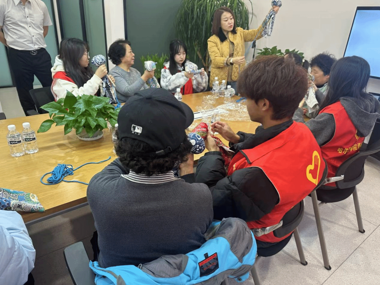 活动伊始,学府四道街社区郭凤明主任组织志愿者与社区老年朋友们进行自我介绍,拉近志愿者与社区老年朋友的距离。在社区负责人员讲述艾草锤的制作方法之后,我校青年志愿者分组协助社区老年朋友完成艾草锤的制作。