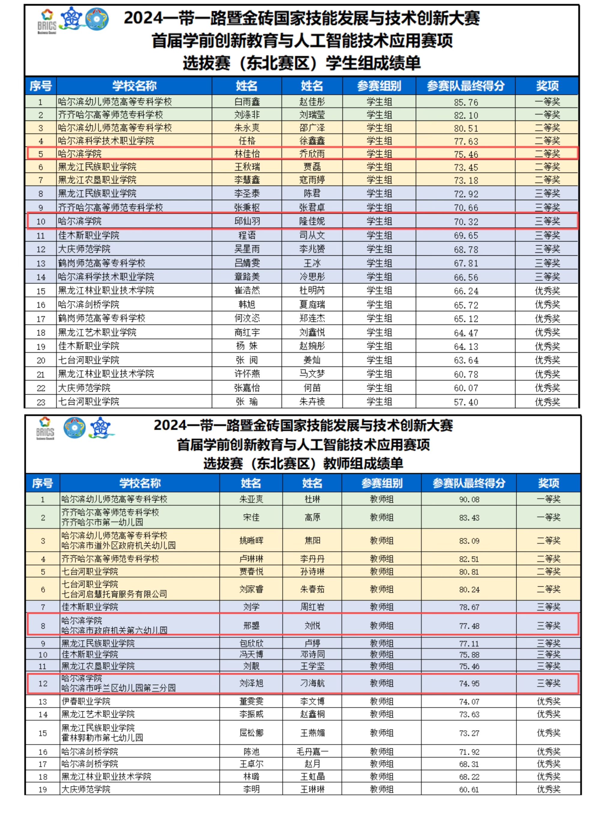 (文/王菠)11月5日,由金砖国家工商理事会中方理事会、一带一路暨金砖国家技能发展国际联盟、中国科协“一带一路”暨金砖国家技能发展与技术创新培训中心主办的2024一带一路暨金砖国家技能发展与技术创新大赛之首届学前创新教育与人工智能技术应用赛项东北赛区选拔赛在哈尔滨幼儿师范高等专科学校举行。我校教师教育学院副院长刘亨荣、学前教育专业系主任王菠带领我校4组师生参赛,并同步参加了“人工智能+时代学前创新教育与创新型幼教人才培养高峰论坛”。经过激烈角逐,我校学前教育专业教师邢曌、刘泽旭与幼儿园教师组团参赛分别荣获三等奖;学生林佳怡、乔欣雨荣获二等奖,邱仙羽、隆佳妮荣获三等奖。