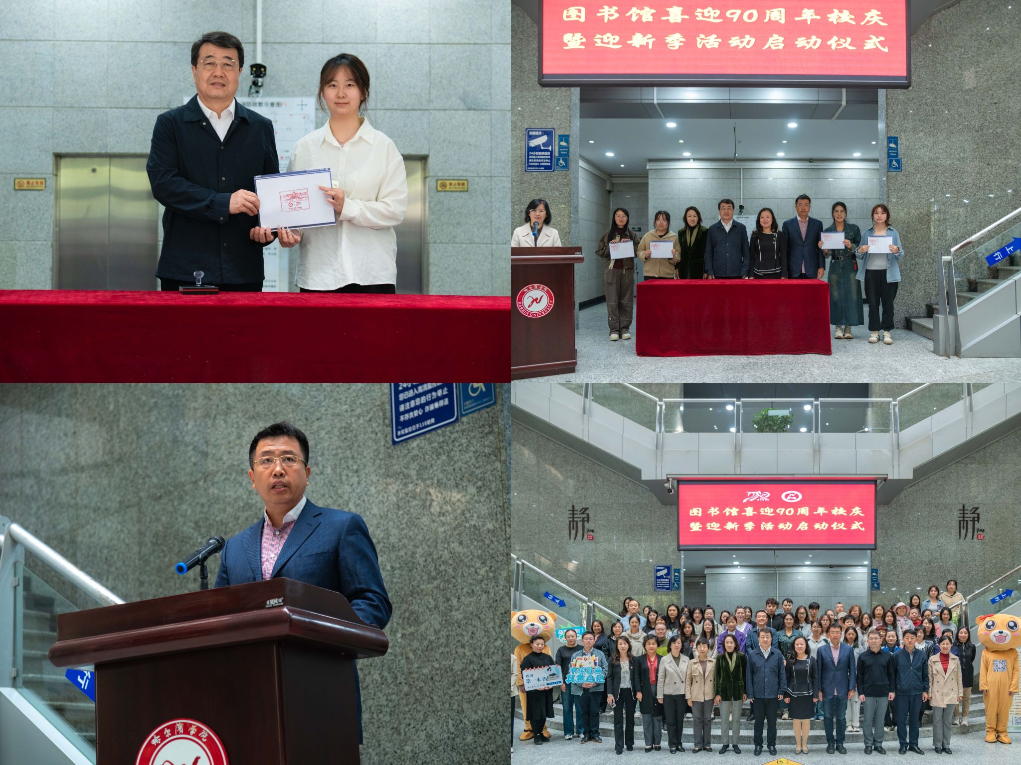 9月23日上午,在图书馆一楼大厅举行“喜迎九十周年校庆暨迎新季活动”启动仪式。于成学校长为迎新季活动盖下了首枚印章。党委副书记李娜、纪委书记马弘莉、副校长吴旭峰为同学们颁发了打卡纪念册。副校长吴旭峰在启动仪式上致辞。