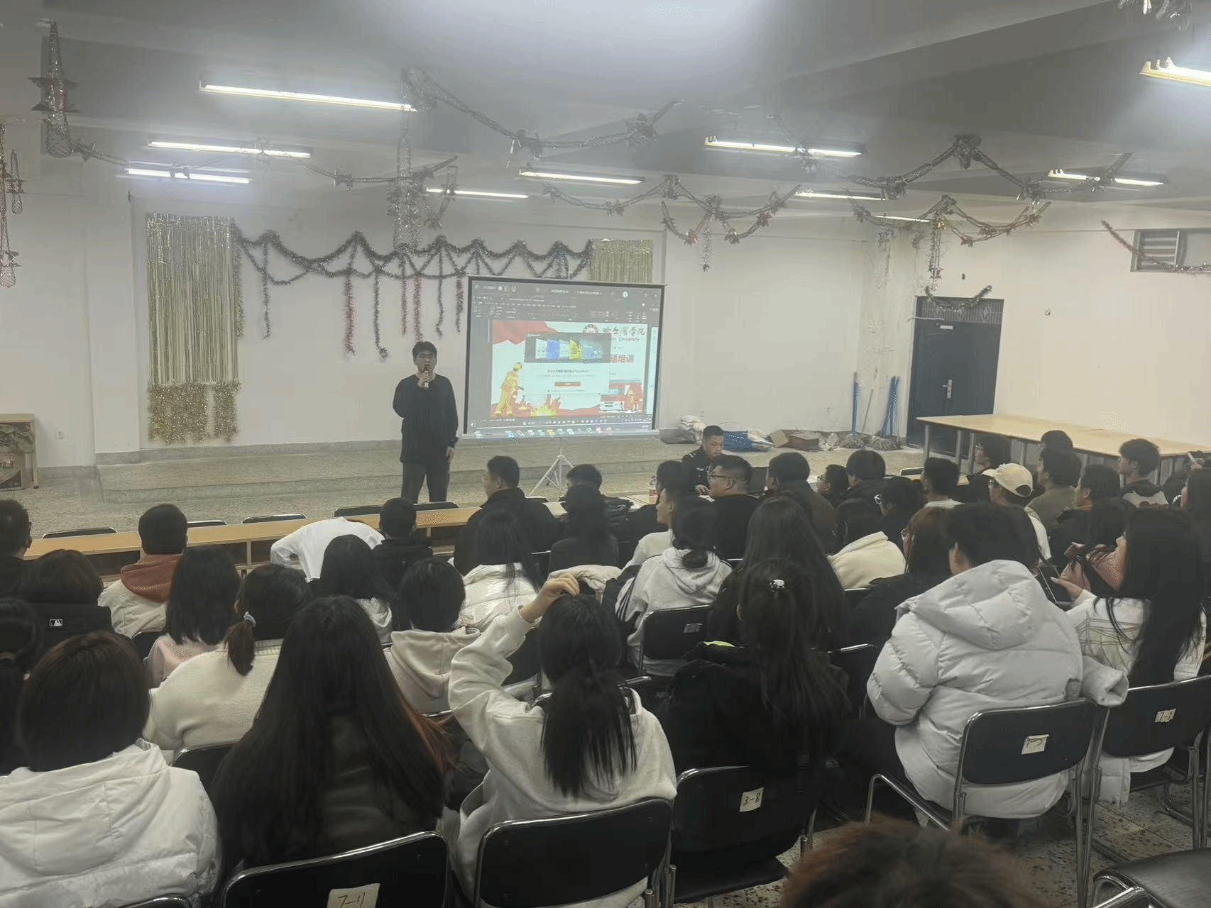 (文/李丹)为增强学生消防安全意识,提高火灾逃生能力,我校于11月15日晚在学生社区活动室为舍务消防志愿者90余人进行了校园消防安全知识培训。此次培训特别邀请了保卫处防火科相关工作人员,孙岩老师进行主讲。