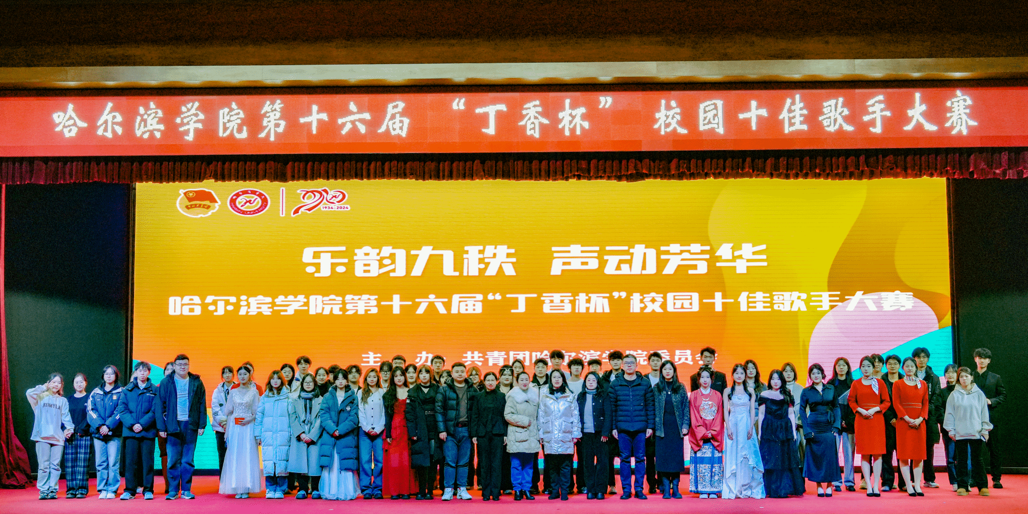 (文/李一宁)以青春之名,唱响九秩华章。11月25日晚,由校团委主办、校园广播台承办的“乐韵九秩 声动芳华”哈尔滨学院第十六届“丁香杯”校园十佳歌手大赛在图书馆报告厅举行。学生处副处长庞哲、校团委副书记张玉娟、挂职副书记张泽众及各学院分团委书记、学生代表观看比赛。音乐与舞蹈学院音乐表演专业声乐教研室主任修雪卿、音乐学专业声乐教研室主任陈艳、音乐表演专业声乐教师邱洋洋担任大赛评委。