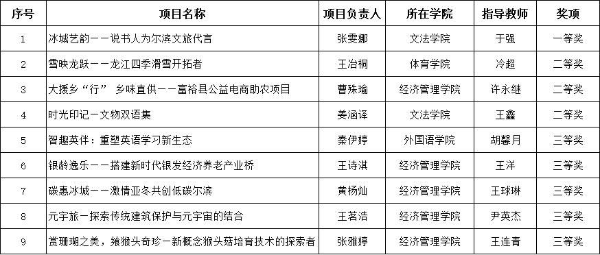 本次“创新创业项目创意设计与计划竞赛”参赛范围是2024年秋季学期《创新创业导论课》授课班级,共计42支双创团队参赛,参赛项目聚焦低碳环保、人工智能、智慧社区、文化旅游、冰雪运动等助力龙江经济建设发展的重要领域,经过初赛、复赛阶段的角逐,9个项目晋级决赛。决赛中,评审专家从参赛项目的创新性和可行性、市场分析、产品(服务、技术)分析、营销策略分析、财务分析、成本管理、风险控制、公司架构、团队建设、现场展示与答辩表现等方面对参加比赛的项目进行全面、客观的评审,最终文法学院张雯娜团队的项目《冰城艺韵——说书人为尔滨文旅代言》获得一等奖;体育学院王冶桐团队的项目《雪映龙跃——龙江四季滑雪开拓者》、经济管理学院曹殊瑜团队的项目《大援乡“行” 乡味直供——富裕县公益电商助农项目》和文法学院姜涵译团队的项目《时光印记—文物双语集》获得二等奖;外国语学院秦伊婷团队的项目《智趣英伴:重塑英语学习新生态》、经济管理学院王诗淇团队的项目《银龄逸乐——搭建新时代银发经济养老产业桥》等五个项目获得三等奖。
