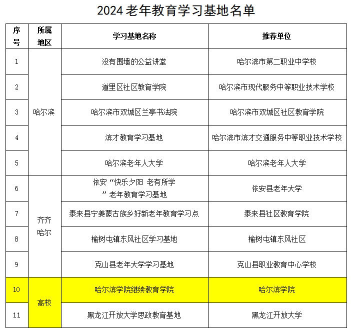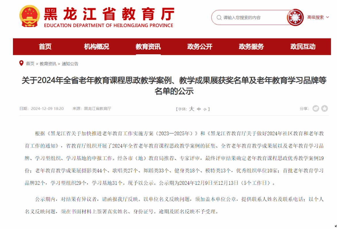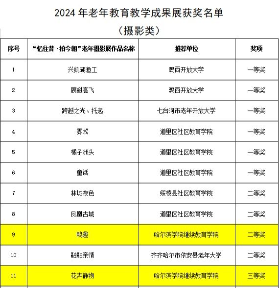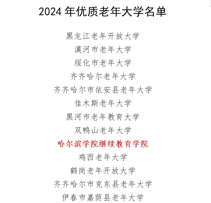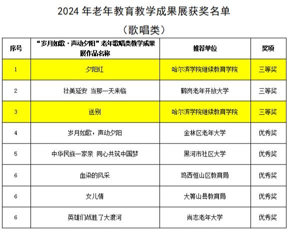 近日,黑龙江省教育厅公布了2024年全省老年教育课程思政优秀教学案例、教学成果展、老年教育学习基地以及优质老年大学等多项评审结果,我校继续教育学院在此次评选中表现卓越,收获颇丰,充分展现出了在老年教育领域的强劲实力与积极贡献。