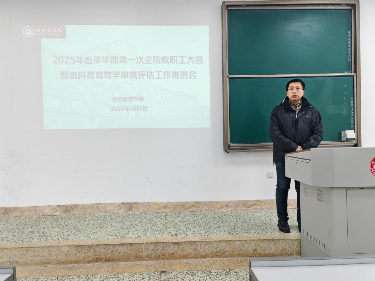 (文/赵浏洋)为全面贯彻落实学校2025年工作会议精神,部署学院重点任务,推进学院审核评估工作,乘着哈尔滨学院第六届教职工代表大会第一次全体会议的东风,3月1日上午,经济管理学院于8102教室召开2025年春季学期第一次全院教职工大会暨本科教育教学审核评估工作推进会,吴旭峰副校长出席会议并讲话,学院领导班子和全体教职工参会,会议由经济管理学院党委书记孙亮主持。