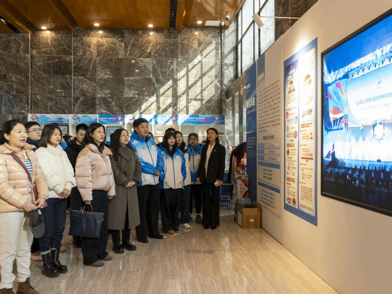 在讲解员的带领下,志愿者们沿“使命催征-申办攻坚-蓝图擘画-文化铸魂-科技赋能-全民共享”六大主题单元展开深度研学。讲解员详细地讲解了哈尔滨第九届亚冬会以“冰雪同梦、亚洲同心”为主题,着重体现亚洲风采、中国气派、龙江特色、冰城魅力,将“同梦”“同心”与“中国梦”紧密联系,以亚冬会为纽带,推动亚洲各国携手合作,共同发展,同时,还就亚冬会奖牌融入“龙江元素”、亚冬会各大竞赛场馆及赛事的筹备情况、亚冬会会歌《尔滨的雪》、亚冬会志愿者徽章等内容进行具体说明。