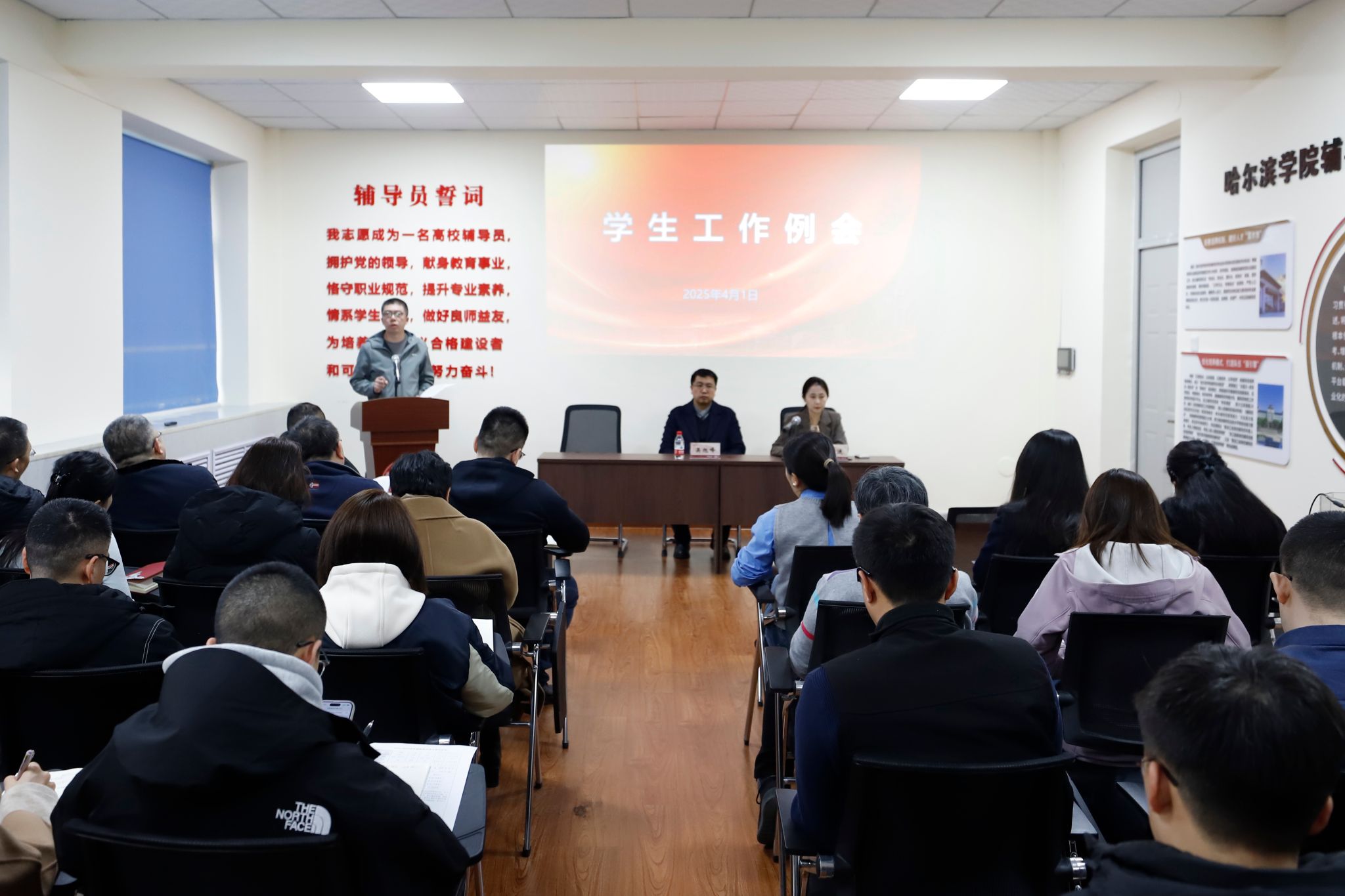 (文/卢涛)4月1日,学校在崇德楼辅导员之家召开学生工作例会,党委委员、副校长吴旭峰出席会议并讲话,学生处处长于迪主持会议,各二级学院党委副书记、全体辅导员及学生处科级以上干部参加会议。