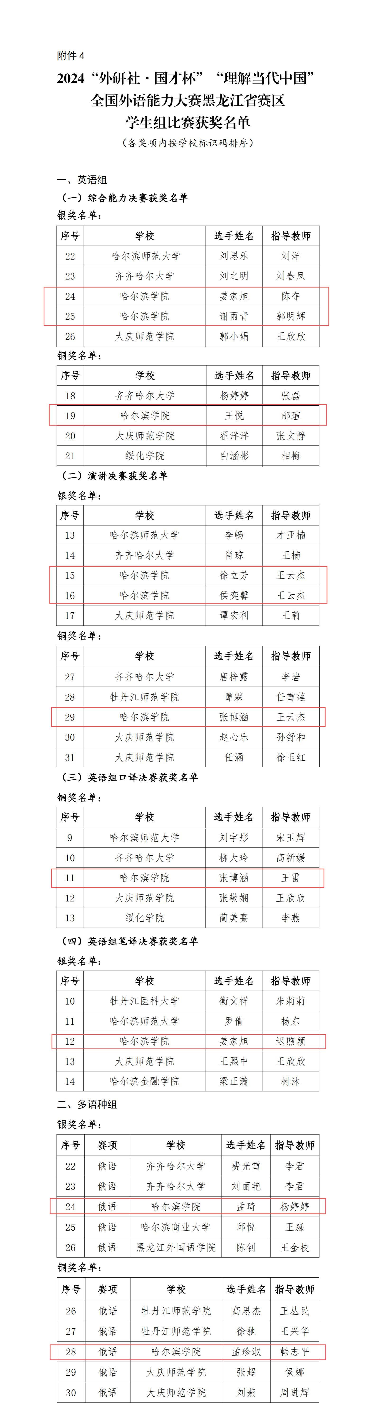 (文/陈涵)近日,中共黑龙江省委宣传部、黑龙江省教育厅联合公布2024“外研社·国才杯”“理解当代中国”全国外语能力大赛黑龙江省赛区国赛和省赛获奖名单。我校共有10名同学在英语组和多语种组获得奖项,其中,英语组综合能力决赛银奖2人,铜奖1人;演讲决赛银奖2人,铜奖1人;英语组口译决赛铜奖1人;笔译决赛银奖1人。多语种组银奖1人,铜奖1人。