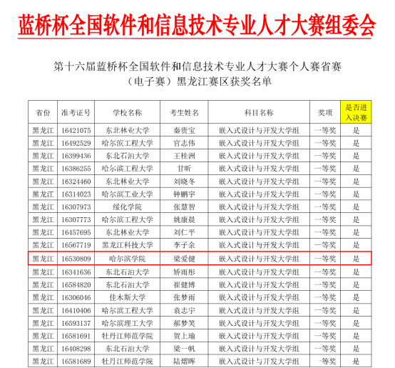 (文/兰文宝)近日,第十六届“蓝桥杯”全国软件和信息技术专业人才大赛黑龙江省赛成绩揭晓,土木建筑工程学院梁爱健同学凭借扎实的专业技能和出色的表现,在嵌入式组比赛中脱颖而出,荣获蓝桥杯黑龙江赛区嵌入式赛道省级一等奖,并成功晋级全国总决赛。