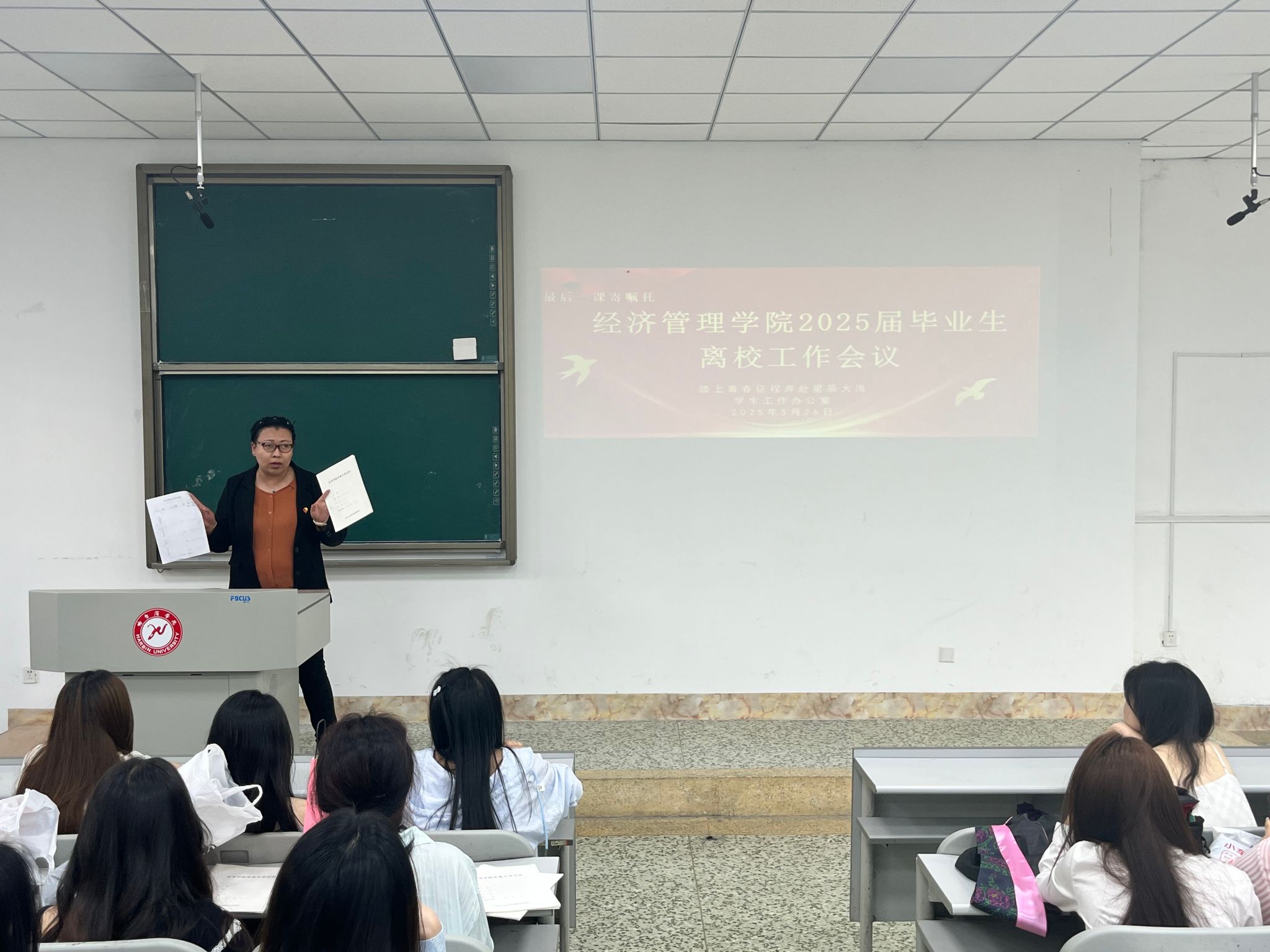(文/高晶)为贯彻落实立德树人根本任务,加强毕业生思想政治教育,服务学生成长成才,切实做好2025届毕业生离校工作,确保毕业生安全、文明、有序离校工作,5月26日下午,经济管理学院在8101教室召开2025届毕业生离校前的“最后一课”,经济管理学院党委书记沙迪、学工办主任高晶、毕业班辅导员毕雅男及2025届毕业生参会。