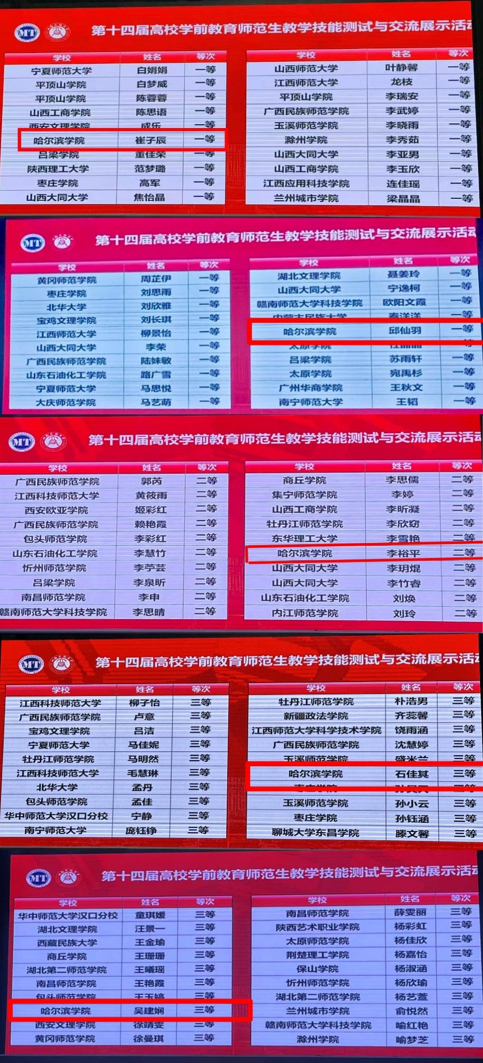 教师教育学院学前教育专业5名学生参赛,邱仙羽(指导教师:刘翀)、崔子辰(指导教师:王菠)荣获一等奖,李裕平(指导教师:宗勤瑶)荣获二等奖,石佳其(指导教师:刘泽旭)、吴建娴(指导教师:邢曌)荣获三等奖。