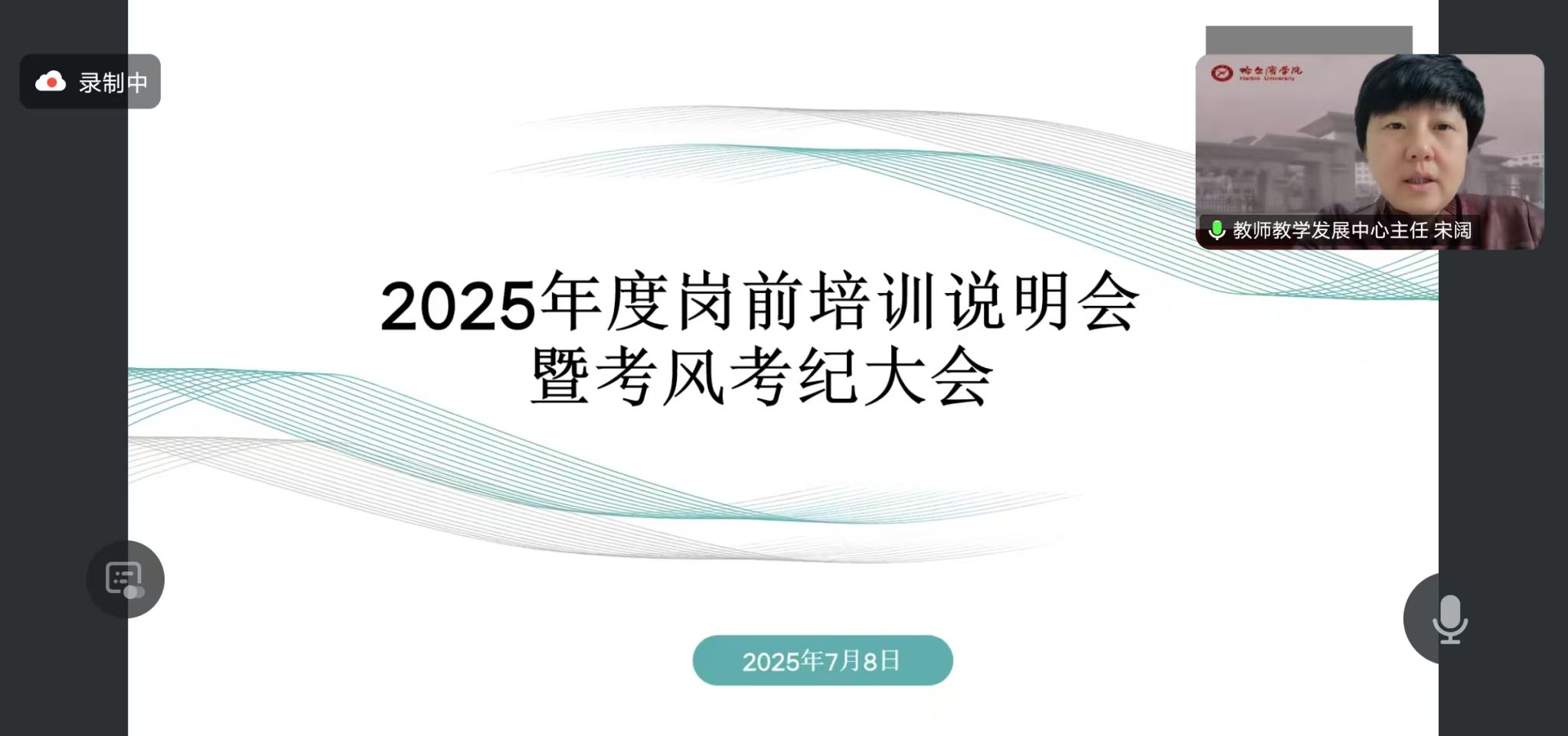 (文/朱孚)为贯彻落实中共中央、国务院《关于弘扬教育家精神加强新时代高素质专业化教师队伍建设的意见》精神,全面落实黑龙江省教育厅关于做好全省2025年高等学校教师岗前培训工作的具体要求和工作部署,教师教学发展中心于7月8日上午召开“2025年度岗前培训说明会暨考风考纪大会”,全校报名参加本期岗前培训的75名教师线上参会。会议由教师教学发展中心主任宋阔主持。