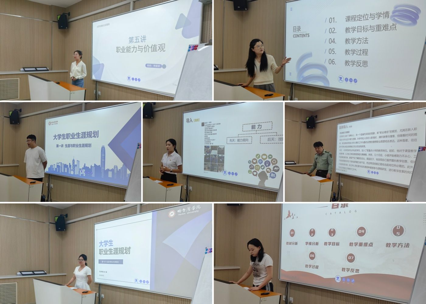 试讲过程中,教师们依次上台展示说课内容。在紧凑的10分钟时限内,他们清晰阐述课程设计思路,展示教学方法多样性,包括情景模拟、案例分析和小组讨论等。教师们注重理论与实际结合,突出了就业指导课程的实用性和前瞻性,展现了较高的专业素养和教学热情。