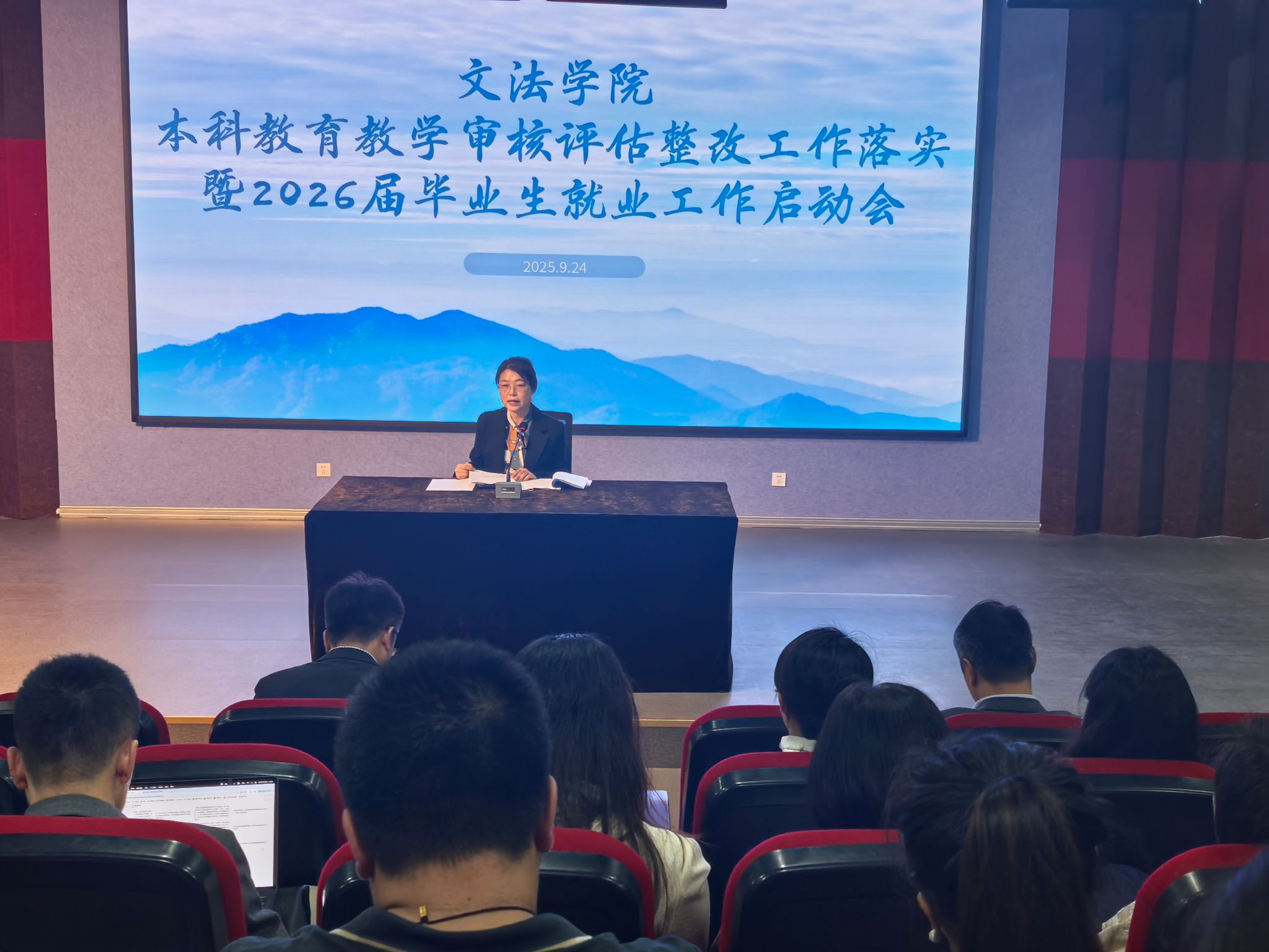 (文/曹晶)9月24日下午,文法学院本科教育教学审核评估整改工作落实暨2026届毕业生就业工作启动会议在崇德楼1401演播厅召开。学院领导班子成员及全体教师参加会议,会议由学院党委书记杜真强主持。
