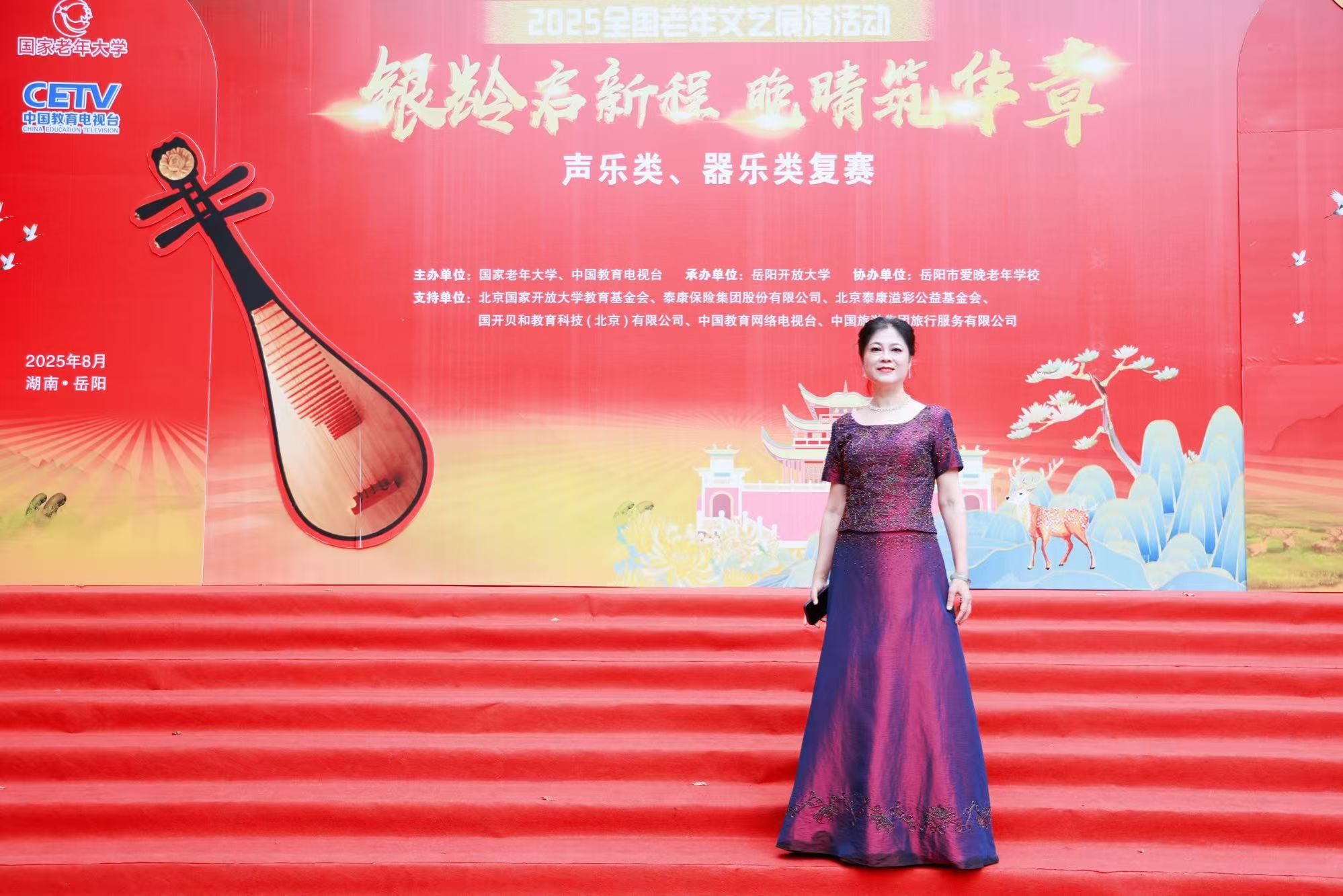 在我校声乐教师侯春波的悉心指导下,市民学员王晓梅凭借一曲《红梅赞》从全国九千余件声乐作品中脱颖而出,成功跻身全国前一千强并进入复赛阶段,最终在8月28日岳阳举行的复赛中,以优异的表现荣获由国家老年大学、中国教育电视台联合颁发的2025“乐龄杯”全国老年文艺展演活动荣誉证书。