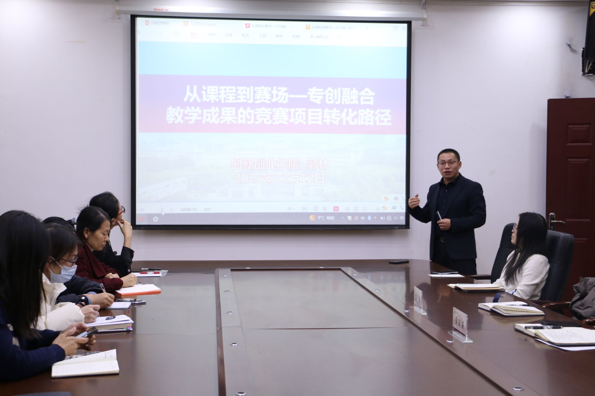 (文/李健)为进一步加强省级双创学院内涵建设,健全创新创业课程体系,切实推进我校创新创业教育教学改革,按照学校2025年“双创教育月”工作部署,11月12日下午,我校在3号教学楼106会议室召开“专创融合”示范课程建设研讨会。学校第二批和第三批“专创融合”示范课程建设项目负责人以及创新创业学院全体教师参加会议。会议由创新创业学院院长黄丽丽主持。