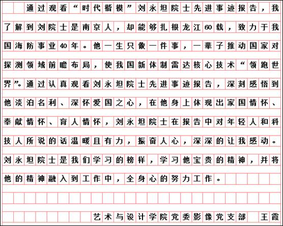 按照市委学组办《关于线上收看“时代楷模”刘永坦先进事迹报告会的通知》和学校党委宣传部、组织部要求,艺术与设计学院党委组织全体党员于10月29日19时,通过“极光新闻”客户端直播收看报告会,师生反响热烈。各支部书记又组织教师党员结合工作实际书写观后感言,深入开展艺术与设计学院“迎接校第二次党代会召开,亮身份、领任务、做表率”活动。教师党员韩东晨、冀德玉、王志海、王惠、郭杨、杨扬、高阳、高亮、孙世为、王霞、郭鹏程、祝远、田闯、路遥、学生党员王敬然、学生干部杨洁和聂智美等认真撰稿,向楷模学习,为哈尔滨学院的快速发展助力,为艺术与设计学院的美誉度而努力工作!