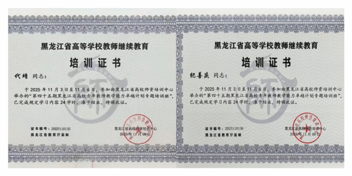 (文/纪善庆、代靖、朱孚)近日,由黑龙江省高校师资培训中心主办的第四十五期黑龙江省高校青年教师教学能力卓越计划专题培训班在哈尔滨华德学院举行。我校教师教学发展中心按照培训要求和工作实际,选派本年度2位新入职教师——教师教育学院纪善庆、人工智能学院代靖参加了本期培训。