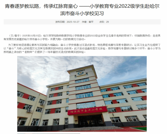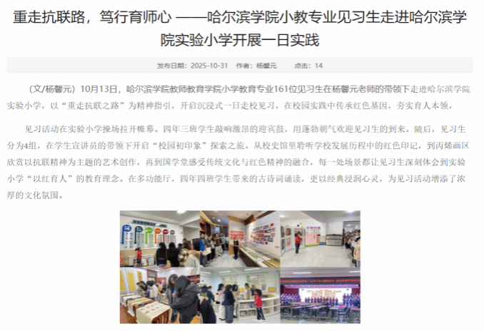 (文/孙学玉)近日,教师教育学院小学教育专业以“弘扬东北抗联精神,建设红色文化育人体系”为主题,启动并实施了一系列创新性的教育见习实践活动。该活动通过召开主题动员会、举行教学技能考核、“走校制”见习及教学实践见习等环环相扣的形式,将红色基因的传承深度融入小学教育专业的实践育人体系,探索出红色文化育人新路径。
