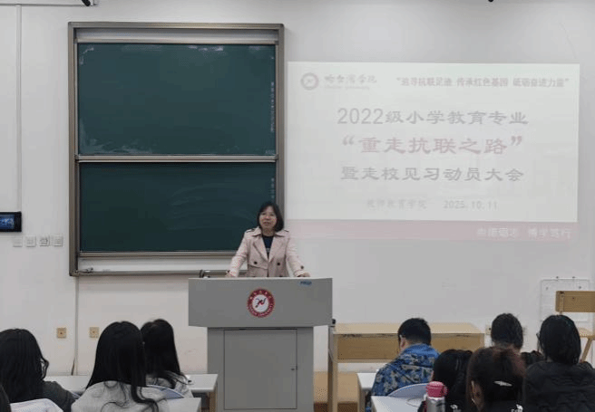 首先,小学教育专业系主任孙学玉专门组织了22级和23级见习动员大会。会上,教师教育学院院长刘亨荣教授深刻阐述了东北抗联精神中“忠诚、坚韧、担当、奉献”的内涵与新时代小学教师职业素养的内在联系,提出走校见习、技能考核、教学实践见习以抗联英烈为榜样,坚定从教信念,肩负起立德树人的光荣使命。