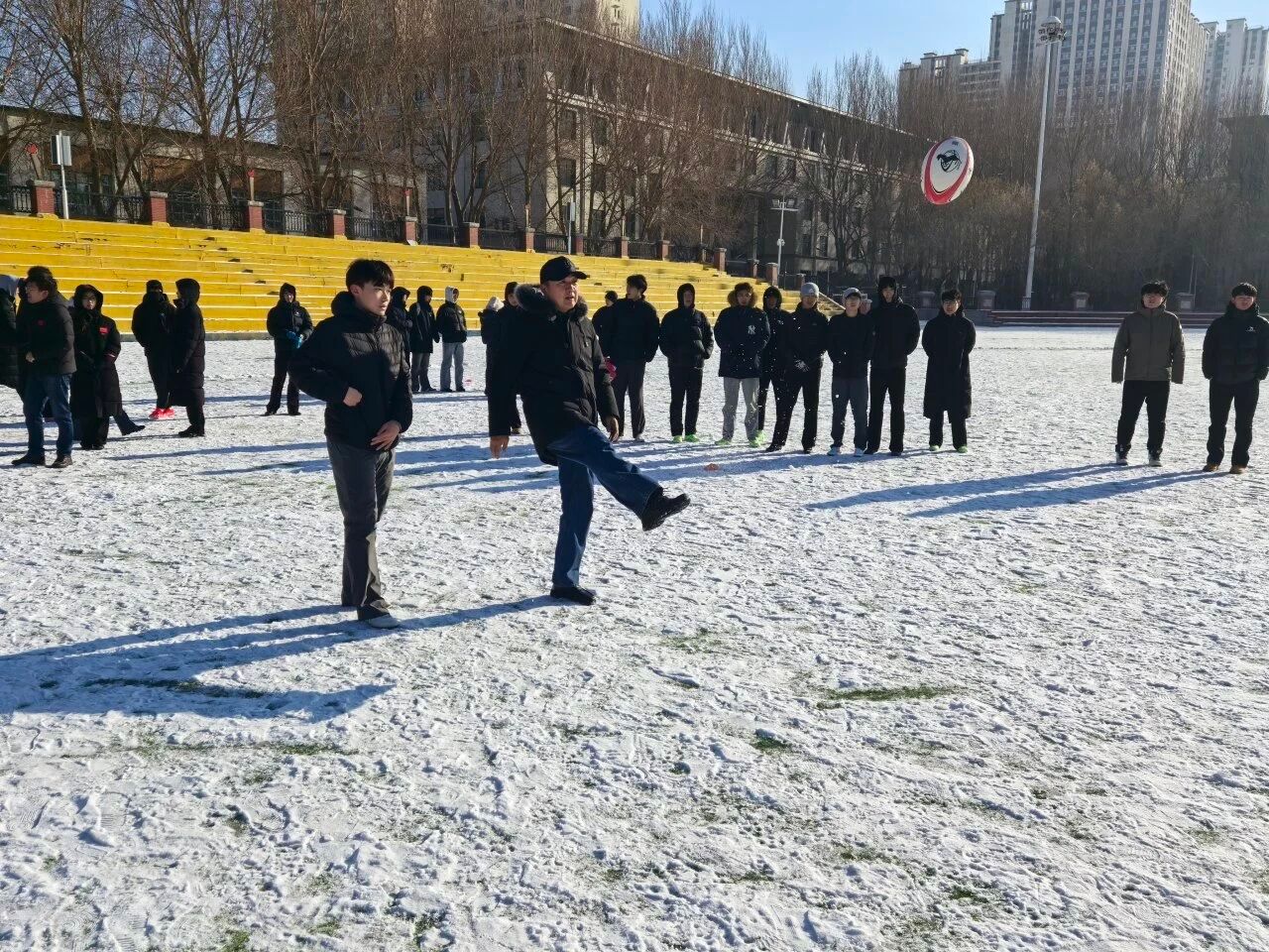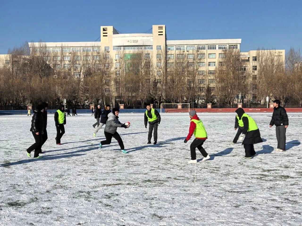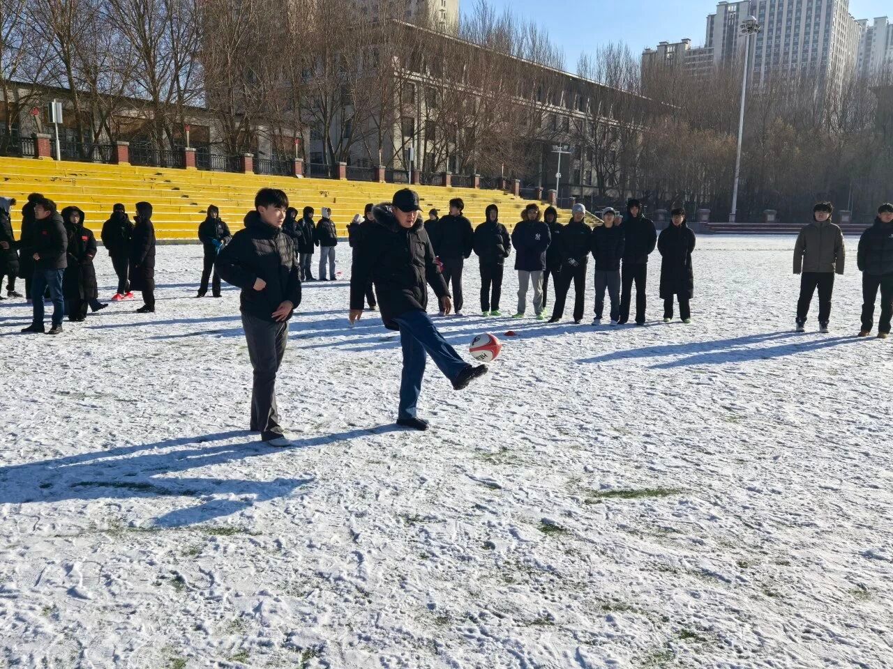 为深入推进学校冰雪文化育人体系建设,丰富冬季冰雪运动场景,激发同学们对新兴体育运动的兴趣,12月5日,体育学院在运动场举办雪地橄榄球兴趣启蒙交流赛。本次活动作为学校科技文化艺术节的特色环节,以“趣味参与、团队协作”为核心,吸引了来自各学院的学生踊跃参赛,在冬日校园里掀起了一股新兴运动热潮。