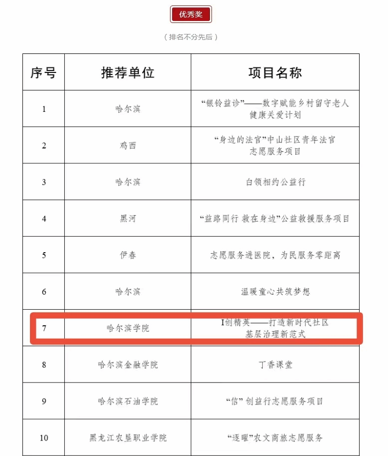 (文/黄婷婷)近日,由共青团黑龙江省委员会、黑龙江省青年志愿者协会联合举办的第八届黑龙江省青年志愿服务项目大赛暨2025年志愿服务交流会评选结果正式揭晓。我校推荐申报的志愿服务项目《I创精英——打造新时代社区基层治理新范式》在激烈角逐中脱颖而出,荣获优秀奖。