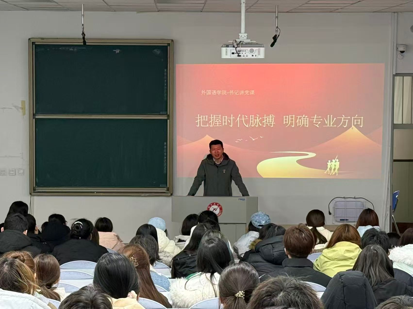 (文/王笑悦)为深化价值引领、筑牢理想信念根基,引导外语学子明确专业定位、勇担时代使命,3月19日下午,外国语学院在6501教室举行“把握时代脉搏 明确专业方向”书记讲党课活动。本次活动由学院党总支书记张志涛作专题讲授,活动由学工办主任王笑悦主持,全体2025级学生参加。