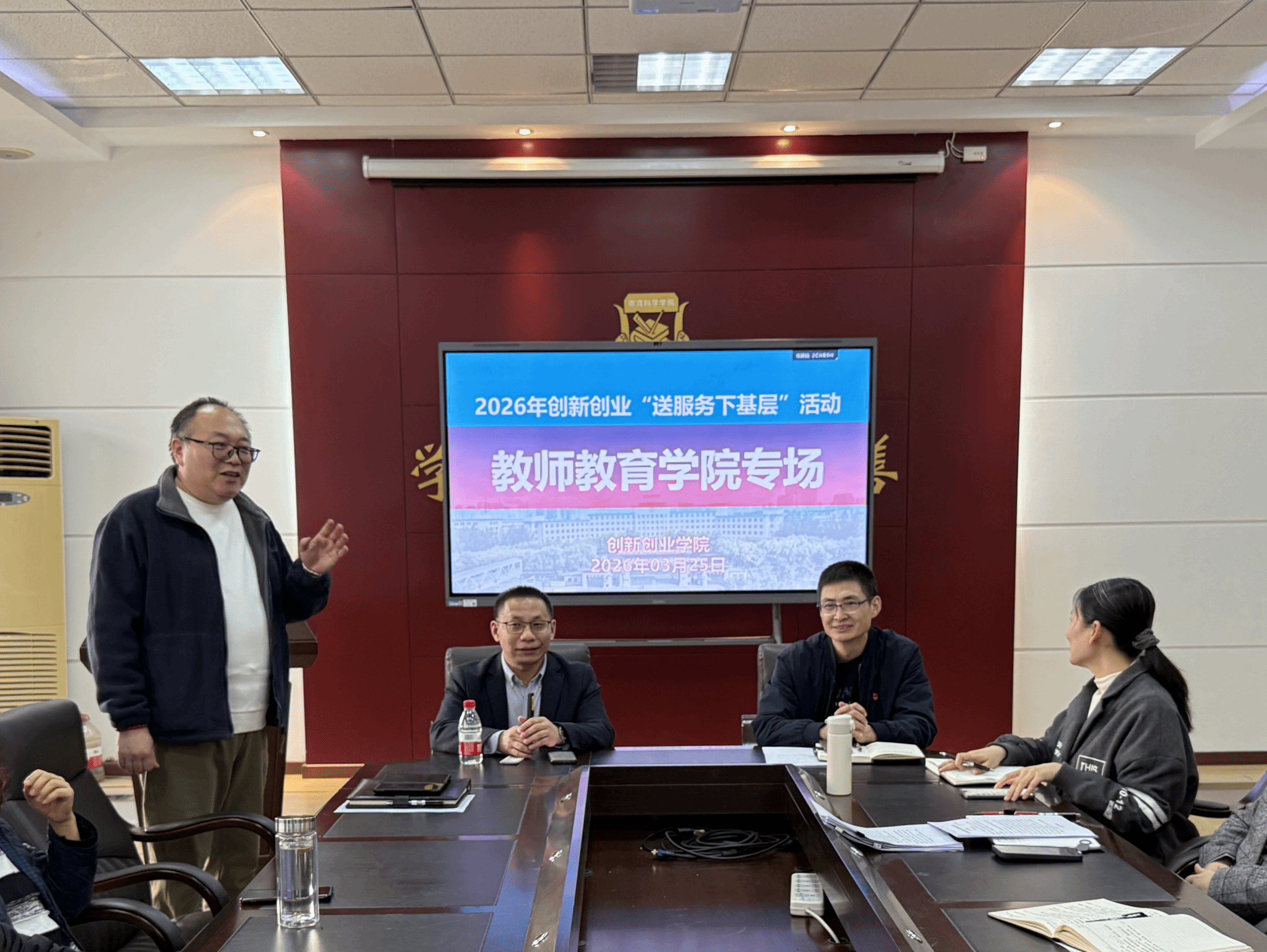 (文/薛婷婷)为推动创新创业教育改革,深化专创融合,提升师生创新创业竞赛综合素养,培养创新思维与创业热情。3月25日,在6211会议室举办创新创业学院“送服务下基层”活动暨教师教育学院创新创业教育工作交流会。会议特邀创新创业学院副院长郭林担任主讲,学院领导班子及全体教师参加交流会。