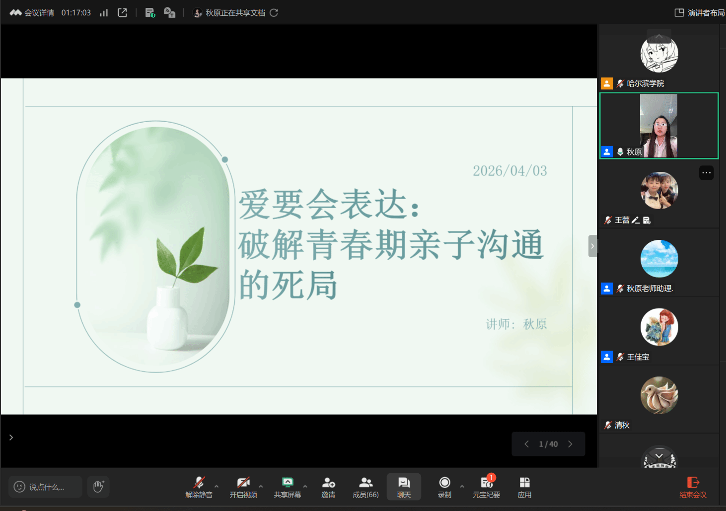 (文/王佳宝)为深入推进哈尔滨市大中小学心理健康教育一体化建设,帮助家长与教师掌握科学的沟通方法,提升家校协同育人实效。4月3日晚,由哈尔滨学院主办的“哈尔滨市大中小心理健康教育一体化”系列线上讲座正式拉开帷幕。第一期主题为《爱要会表达:破解青春期亲子沟通的死局》,特邀资深心理咨询师秋原老师担任主讲,吸引了全市大中小学众多家长、中小学教师,以及我校辅导员、班主任、家长朋友们在线参与。