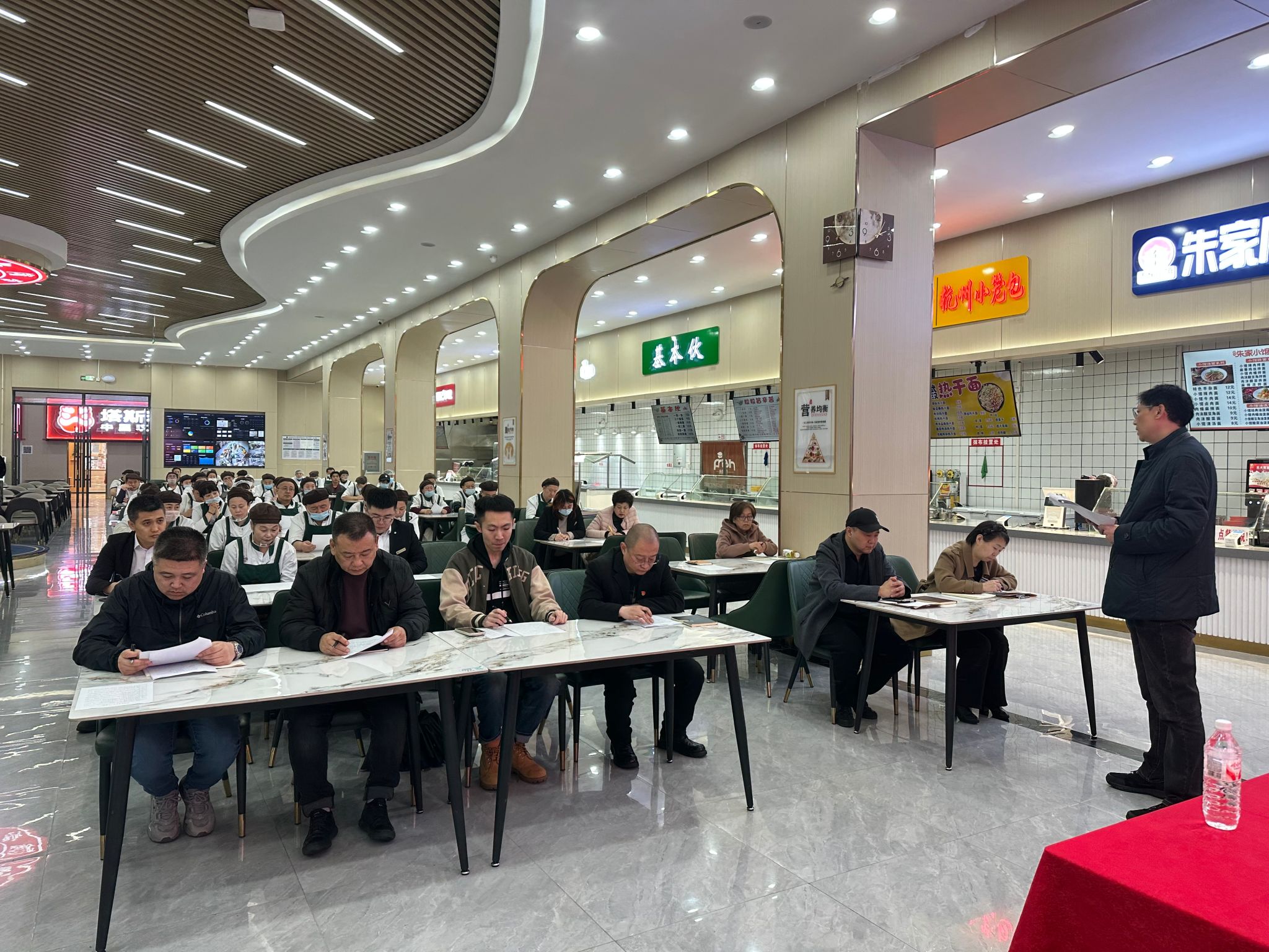 培训结束后,全体参训人员参加了闭卷考核。考核试卷围绕“双十”规范的核心内容设置选择题、判断题、简答题,重点考查从业人员对食品安全责任、操作规范、事故处置等关键知识的掌握程度。考场内,大家仔细审题、认真作答,展现出严谨的态度与扎实的学习成果。