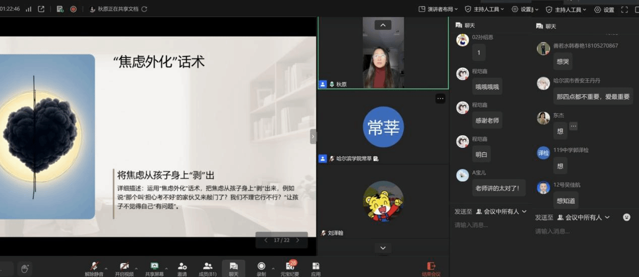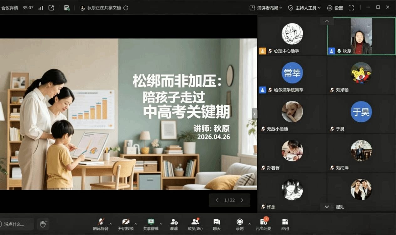 (文/常莘)为扎实推进哈尔滨市大中小学心理健康教育一体化建设,构建家校协同心理支持网络,助力中高考考生平稳度过备考关键期,4月26日,我校举办第二期“哈尔滨市大中小学心理健康教育一体化”系列线上讲座。本次讲座以《松绑而非加压:陪孩子走过中高考关键期》为主题,邀请资深心理咨询师秋原老师担任主讲嘉宾,联盟各中小学教师代表及近百名考生家长线上参与学习。