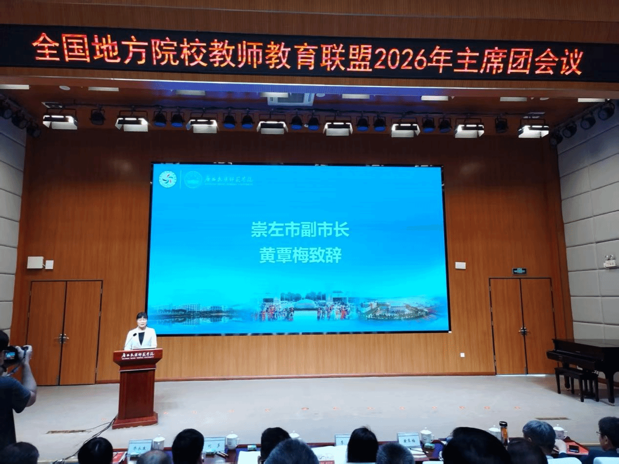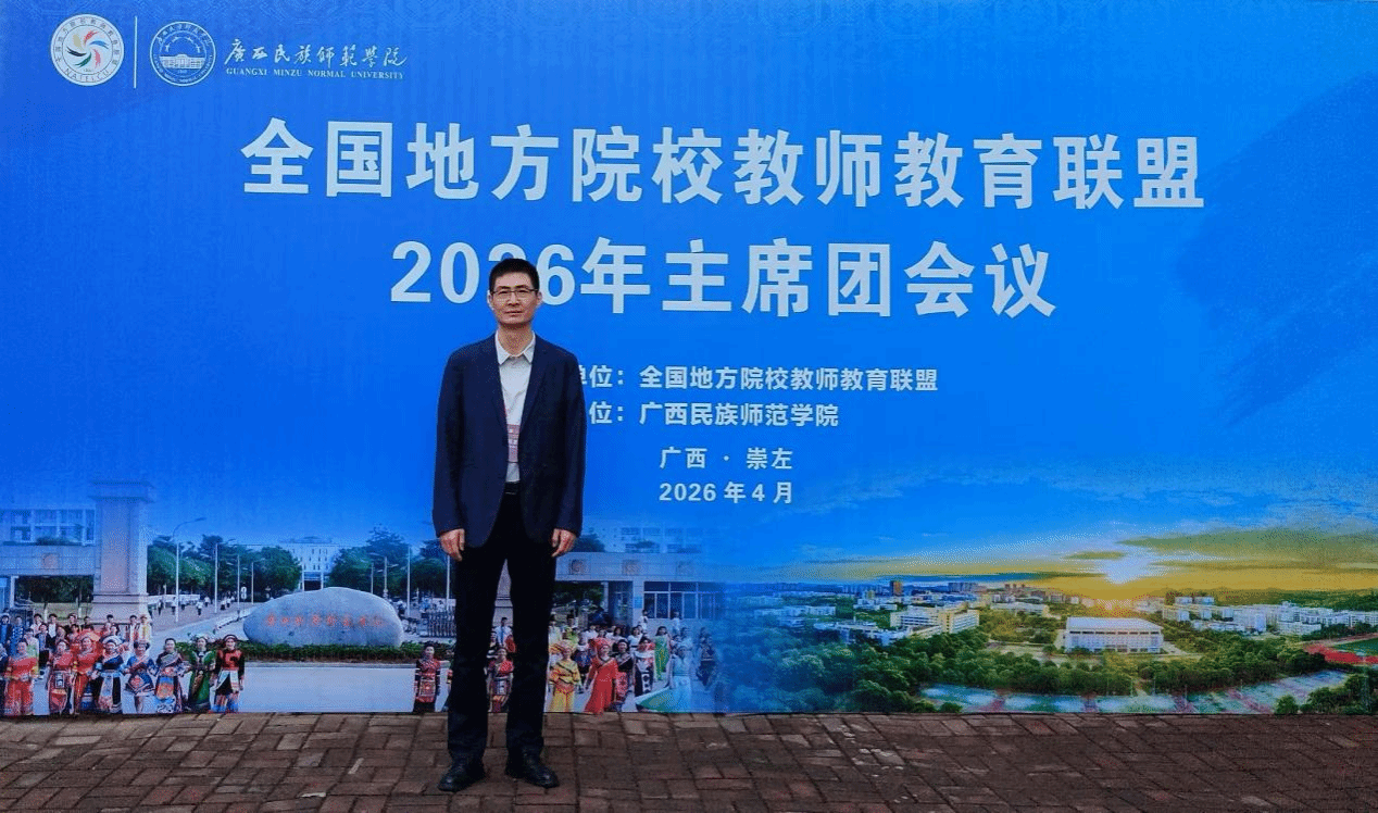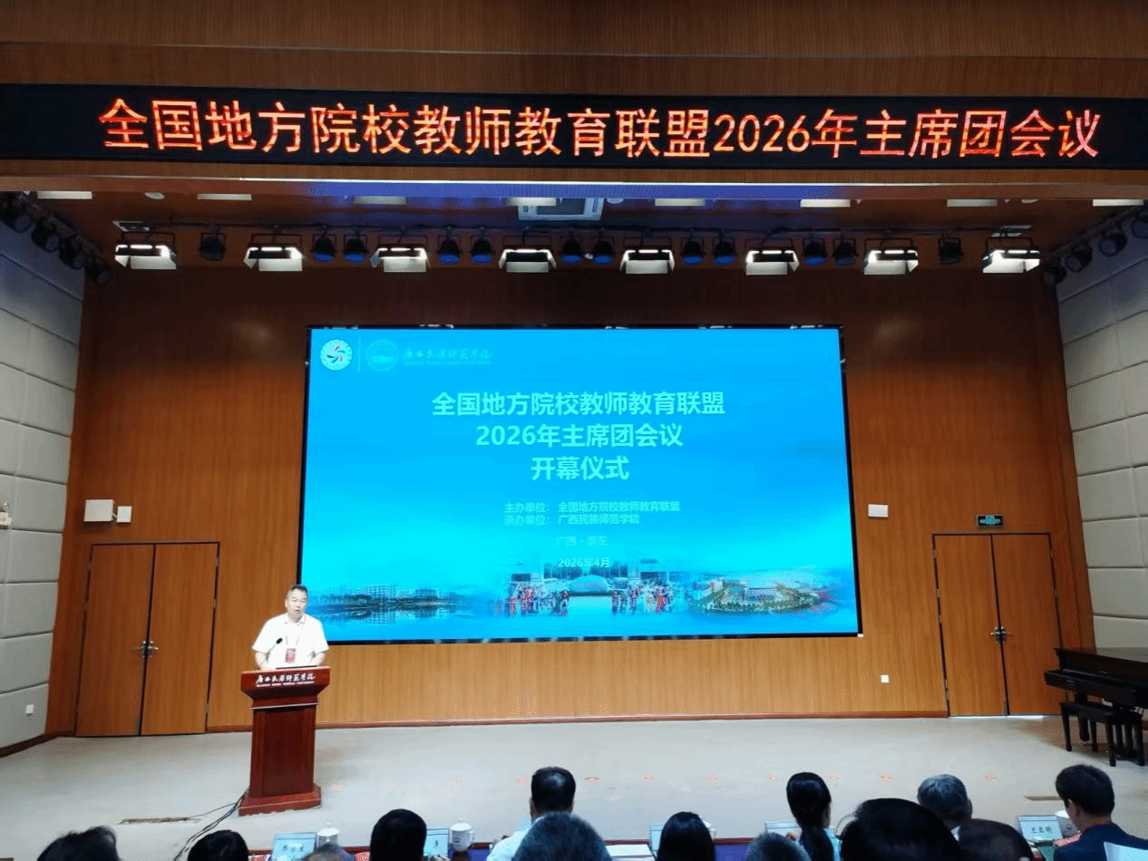 (文/赵金坤)4月23日,全国地方院校教师教育联盟2026年主席团会议在广西民族师范学院举行。会议以“规划引领,师范赋能:地方院校高质量发展新路径”为主题。联盟主席团主席、副主席,秘书处秘书长、副秘书长,以及各成员高校的教学副校长、教务处处长、教师教育学院院长和相关企业领导专家共121人出席会议。联盟秘书处秘书长、肇庆学院副校长肖起清主持会议。我校作为联盟副主席成员单位,教师教育学院党委书记赵金坤代表学校参会。