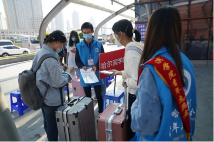 清晨六点多,陆续有祖国各地的新同学到达哈尔滨。哈尔滨站、哈尔滨西站、哈尔滨东站的迎新志愿者们开始忙碌起来,他们为新同学提行李、讲解报到注意事项、引导新同学和家人们快速出站乘坐专用接站车。