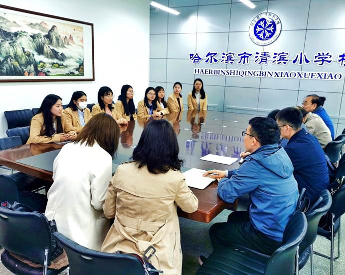 哈尔滨市清滨小学是我校多年实习基地,与我校建立了良好地长期合作关系。此次检查,清滨小学副校长褚福春、教导主任程艳芬和“刘清姝名师工作室”高级教师刘清姝教授热情地接待了我们。褚校长对我校实习生的表现给予高度评价。小学教育专业的个别学生在实习初期的择业意向并非教师,但在短短2个多月的实习期间,在清滨小学良好的教风学风带动下,业务能力得到很大提升,同时也转变了学生的就业意向,毕业后毅然走上了教师职业之路。这些学生职业生涯选择的巨大变化为她留下了深刻印象,而且实习生们这样的转变使她们感到非常欣慰。另外,从不断提升教师基本素养、增加教师教学魅力方面对实习生提出了更高要求。刘清姝教授谈及因“刘清姝名师工作室”与我校建立合作关系,对我校学生的优秀素质能力有一定了解,希望在未来的实习阶段,学生能够从自身优势入手,自主开发多元化的小学课程,范围涵盖烘焙、插花、手工等方面,既能提升实习生业务能力,又可以拓展小学课后服务内容。