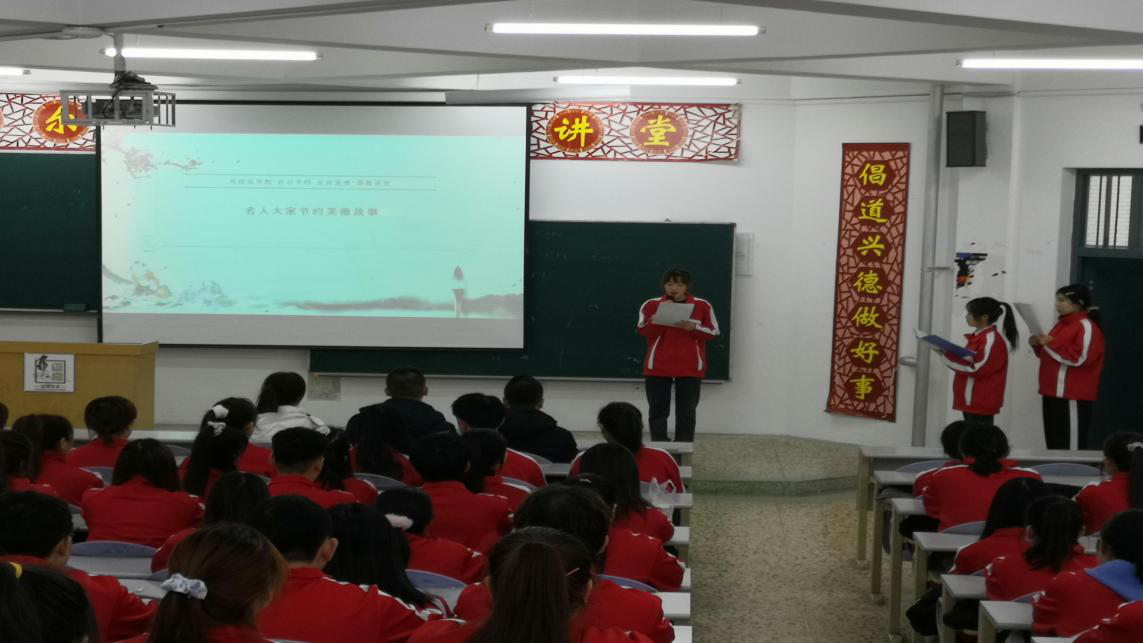 本次活动分为“唱国歌”、“讲道德故事”、“朗读经典,体味名言”、“分享感悟”、“写花絮故事”五个环节。其中最为感人深省的就是第二环节,20级的商英一班刘子琪、商英二班赵晨曦和英语二班唐静三名同学分别向大家分享关于伟人邓小平和雷锋同志在日常生活中发生的勤俭节约小故事。其中,邓小平同志的故事最为让人触动,为了延长毛巾的使用寿命,他选择用挤压毛巾而不是拧毛巾的方式减少毛巾里的水分,一条裤子缝缝补补穿了好多年。这些故事都诉说着老一辈革命先烈的勤俭节约、艰苦奋斗精神,向大家传递无论在革命战争年代还是在和平建设时期,都应坚持勤俭节约、艰苦朴素的生活作风。还有第三环节的诵读经典名言,同学们听了老一辈革命先烈的故事后深受感动,积极踊跃地在班长的带领下齐声诵读名言:“由俭入奢易,由奢入俭难”;“侈,恶之大也”,“静以修身、俭以养德”......,通过诵读不断体会经典名言的重要意义,让同学们深刻体会到,勤俭节约不仅能积累财富,还能培养艰苦创业的精神和奋发向上的品质。最后,同学们通过积极发言,表达了他们对勤俭节约的理解,纷纷表示勤俭节约是中华民族的优良传统,不能停留在口头上,应付诸于实践,要从我做起,从现在做起,从身边小事做起,为中华民族的伟大复兴贡献自己的力量。