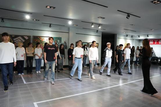 讲座中,张天娇对同学们进行一对一指导训练,为大家系统化地梳理了开肩、展肩、神态应用等基础形体训练动作,使同学们感受到了形体的拉伸与延展。她与同学们交流互动,针对每个人对秀场、模特、服装展示的不同理解进行具体分析,配合三种不同风格的音乐,为学生做了国风走秀、时装走秀、礼服走秀的无实物表演T台展示,让同学们感受了服装表演的魅力和模特对于不同风格服装的塑造能力。通过T台示范,张老师为大家讲解了行进节奏、出场定点造型、台前定点造型、三种不同的转身方式,同时针对行业内常见的T台行进问题进行分析,使同学们在今后的练习过程中能够有意识地规避错误。