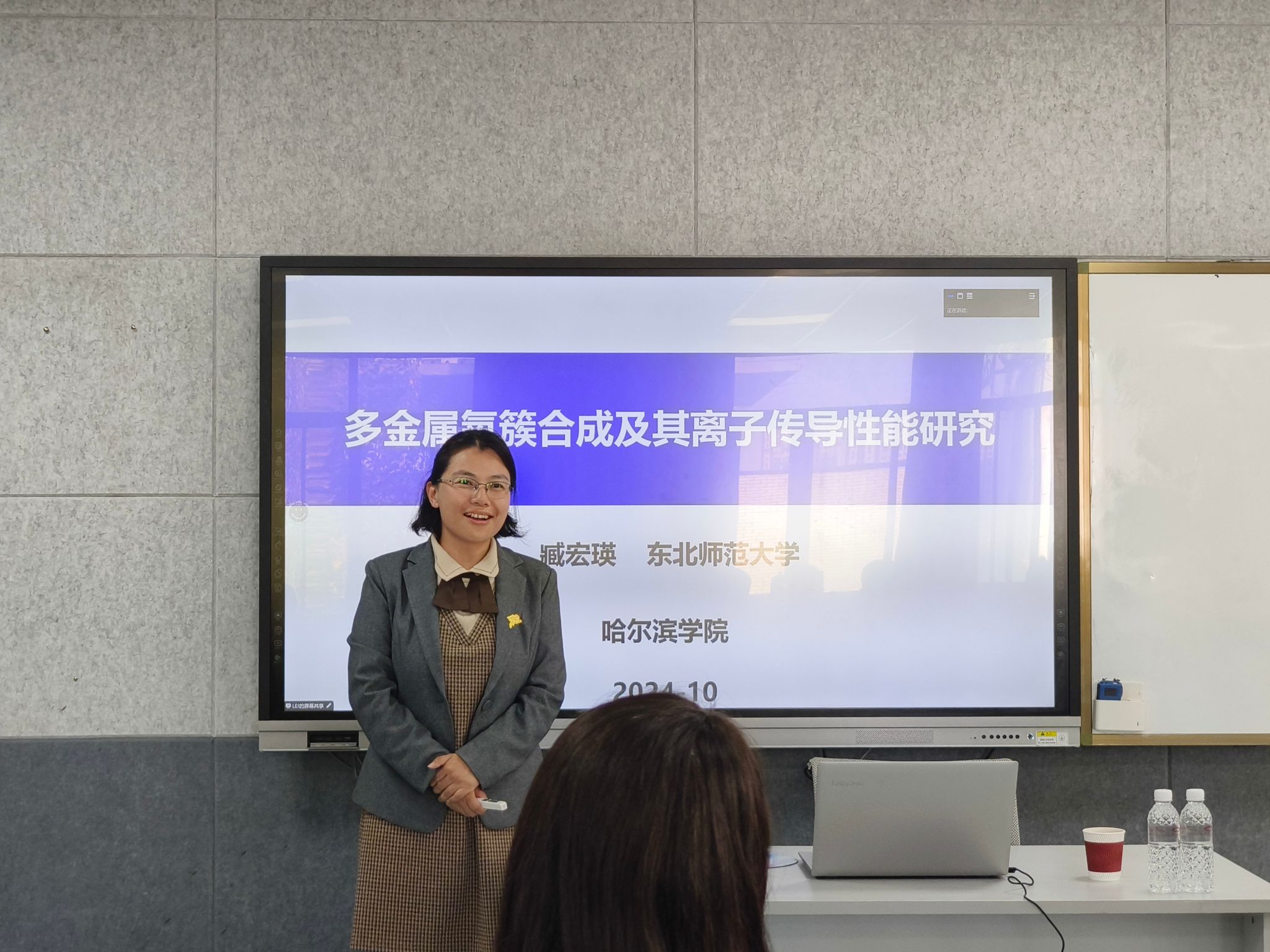 第一场报告邀请了我院2007届化学专业校友,东北师范大学化学学院博士生导师臧宏瑛教授。臧教授长期从事无机化学合成与质子导体研究工作,获批国家优秀青年人才称号,吉林省长白山学者,中国化学会超分子化学专业委员会委员,国际《无机化学前沿》杂志青年编委,清华大学主办《多酸化学》青年编委,吉林省青年科技工作者协会副主任,吉林省第16届青年科技奖,2022年吉林省最美“科技工作者”,2023年长春市“三八”红旗手。臧教授做了题为“多金属氧簇合成及质子传导性能”的学术报告,为食品工程学院教师们深入浅出地讲解了多金属氧簇的合成方法、质子传导性能及其应用,介绍了自己团队的最新研究成果。