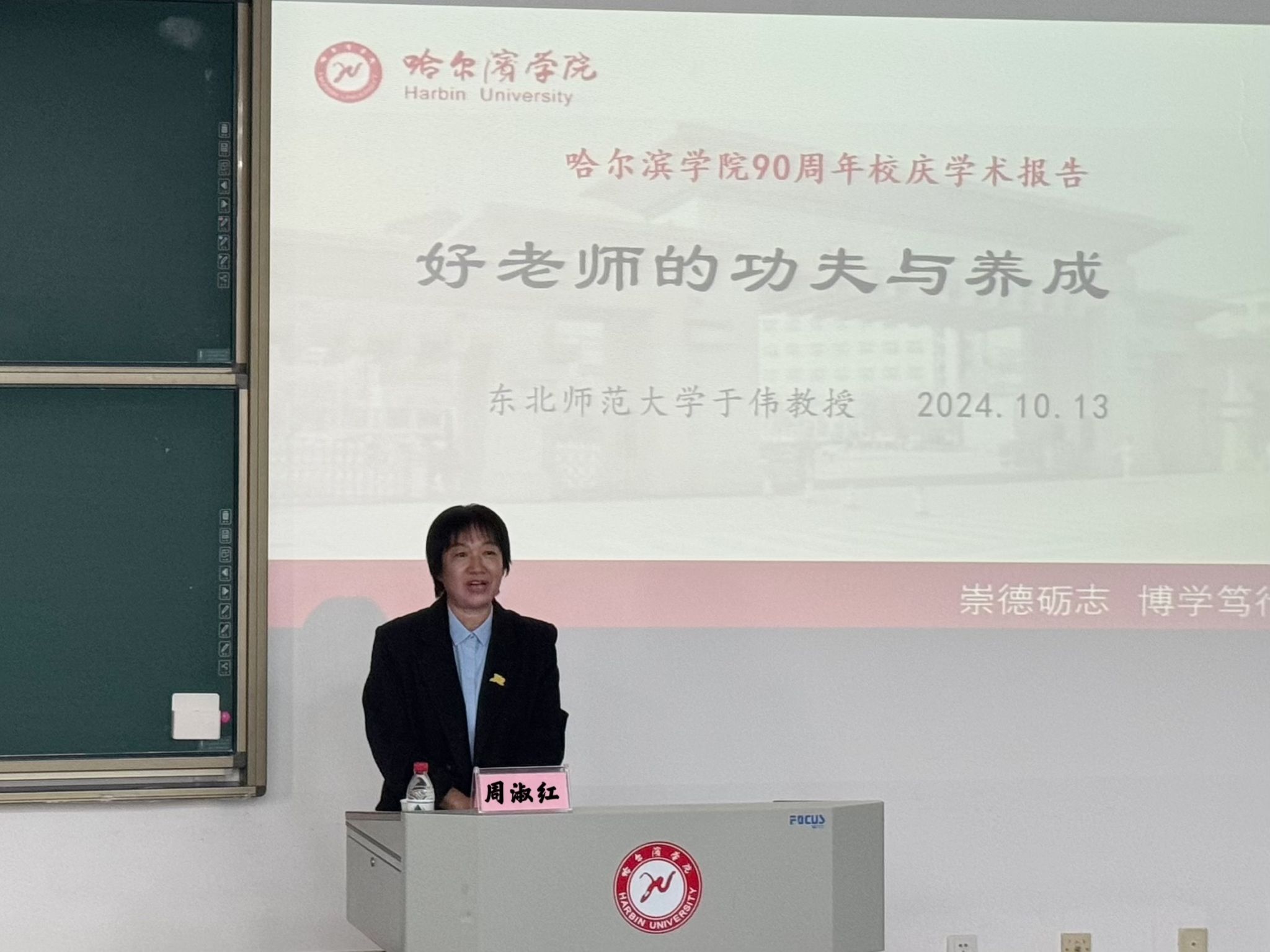 (文/王宇欣)10月13日下午,在6501教室,教师教育学院邀请东北师范大学教育学部教授于伟来校作题为《好老师的功夫及其养成》的学术报告,此次报告会为科技处主办、教师教育学院承办的哈尔滨学院校庆90周年学术报告系列活动之一。教师教育院长周淑红、副院长刘亨荣以及小学教育专业全体师生参加本次活动,报告由教师教育学院小学教育系主任孙学玉主持。