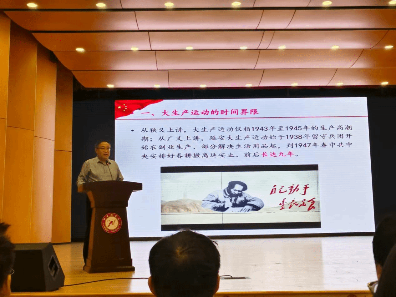李德刚副院长结合自身实地考察陕甘宁边区、南泥湾等旧址的所见所闻,辅以大量历史图片、文献资料,从大生产运动的时间界限、背景、过程、成果、意义等五个方面,为师生生动科普了大生产运动的全貌,指出,大生产运动不仅成功打破了敌人的经济封锁,稳定了根据地经济秩序,克服了抗战困难,为持久抗战提供了坚实的物质保障,更重要的是,大生产运动孕育的“自力更生、艰苦奋斗、实事求是、依靠群众”的精神,成为中国共产党和人民军队的宝贵精神财富,需要大力弘扬。