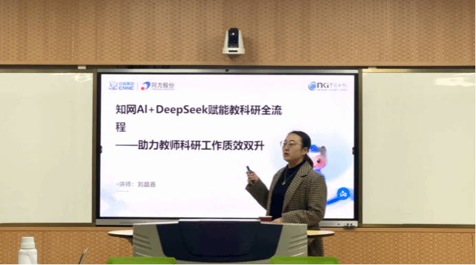 工作坊环节,刘晶鑫以《知Al+DeepSeek赋能教科研全流程——助力教师科研工作质效双升》为主题,从AI引领科研范式变革与科研范式的演进引入,介绍了AI对产业、医疗、生活等方面带来的改变;围绕华知大模型专业、安全、可信三大特点及优势,介绍了华知+DeepSeek打造专业领域“超强大脑”的定位;她从科研选题、文献检索、文献研读、论文写作等方面操作演示了如何规范使用知网AI工具并赋能学习研究全场景。