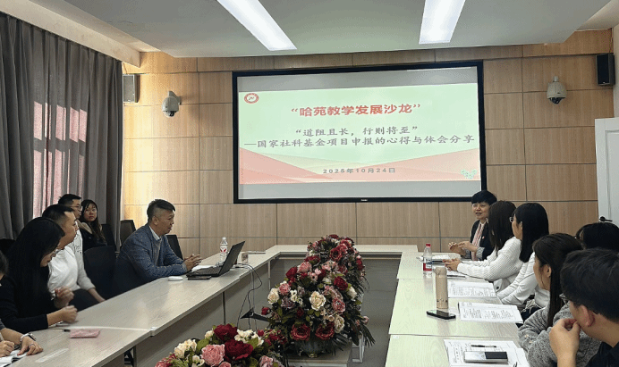 (文/周晶)10月24日,教师教学发展中心开展第六十六期“哈苑教学发展沙龙”暨2025年新教师教学发展研修班教学学术与研究模块课程——《“道阻且长、行则将至”——国家社科基金项目申报的心得与体会分享》。活动通过超星学习通平台直播线上线下同步进行。教师教学发展中心工作人员,2025年新教师教学发展研修班全体学员及线上参培教师百余人参会。活动由教师教学发展中心主任宋阔主持。