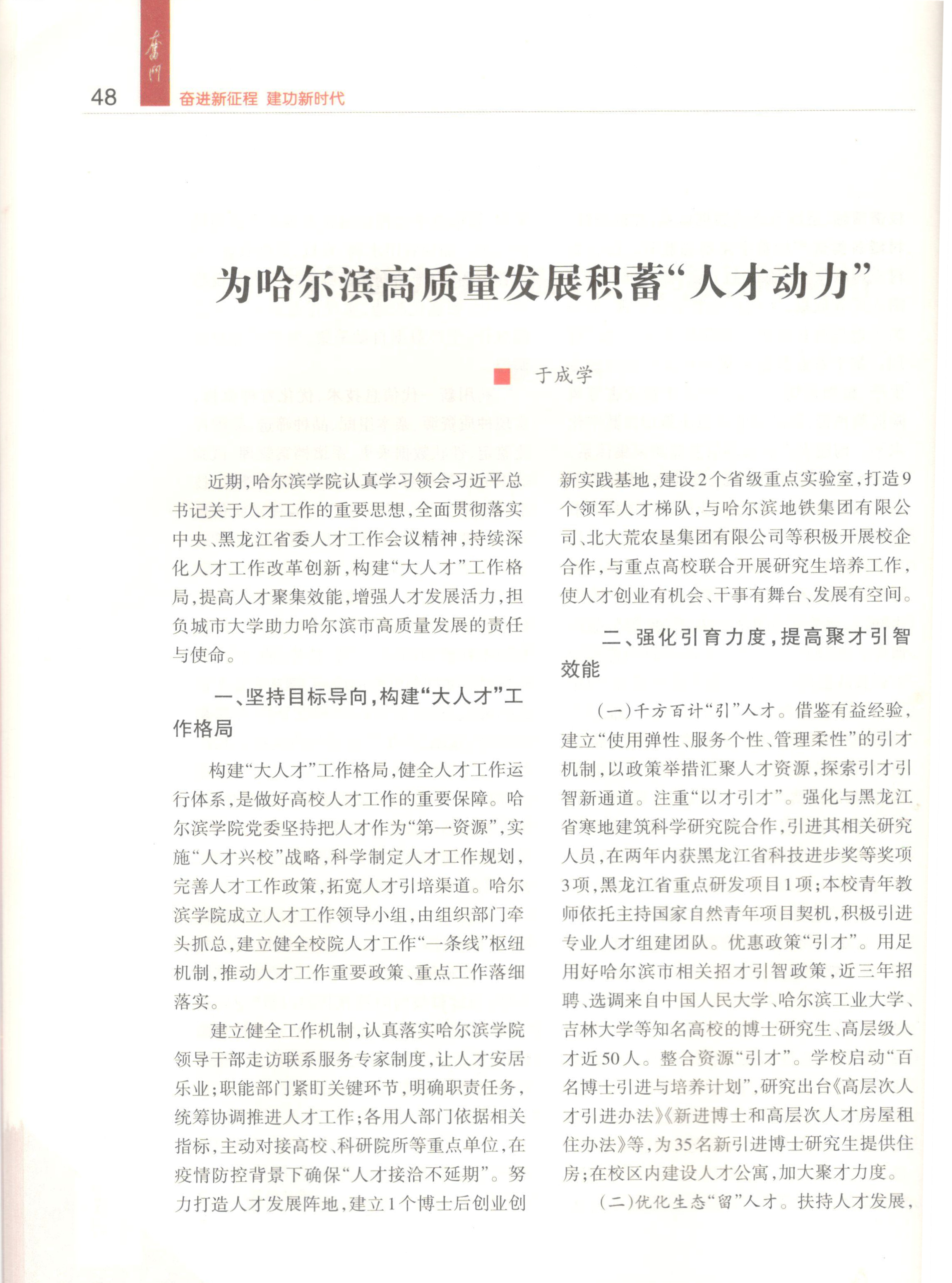 (文/邢珺)近日,在中国共产党黑龙江省委员会主管主办的综合性理论刊物《奋斗》杂志2022年第8期上,我校校长于成学同志发表署名文章:《为哈尔滨高质量发展积蓄“人才动力”》。文章指出,哈尔滨学院认真学习领会习近平总书记关于人才工作的重要思想,全面贯彻落实中央、黑龙江省委人才工作会议精神,持续深化人才工作改革创新,构建“大人才”工作格局,提高人才聚集效能,增强人才发展活力,担负城市大学助力哈尔滨市高质量发展的责任与使命。文章紧密联系实际,全面深刻阐述了我校充分发挥学科优势,对接省市产业发展需求,积极搭建平台,有效发挥人才作用,激发人才潜能取得的工作成效和经验。