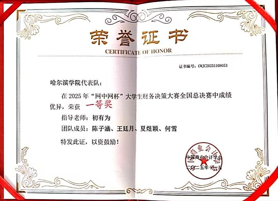 (文/初有为)2025年11月8日,第十三届“网中网杯”大学生财务决策大赛全国总决赛圆满收官。在我院初有为主任的指导下,由陈子涵、王廷月、何雪、夏煜颖四位同学组成的哈尔滨学院代表队表现卓越,勇夺全国总决赛一等奖,延续了我院在该项赛事中的辉煌战绩。此前,该团队先后斩获全国预选赛与省级比赛第一名,实现本届赛事“全满贯”的优异成绩。