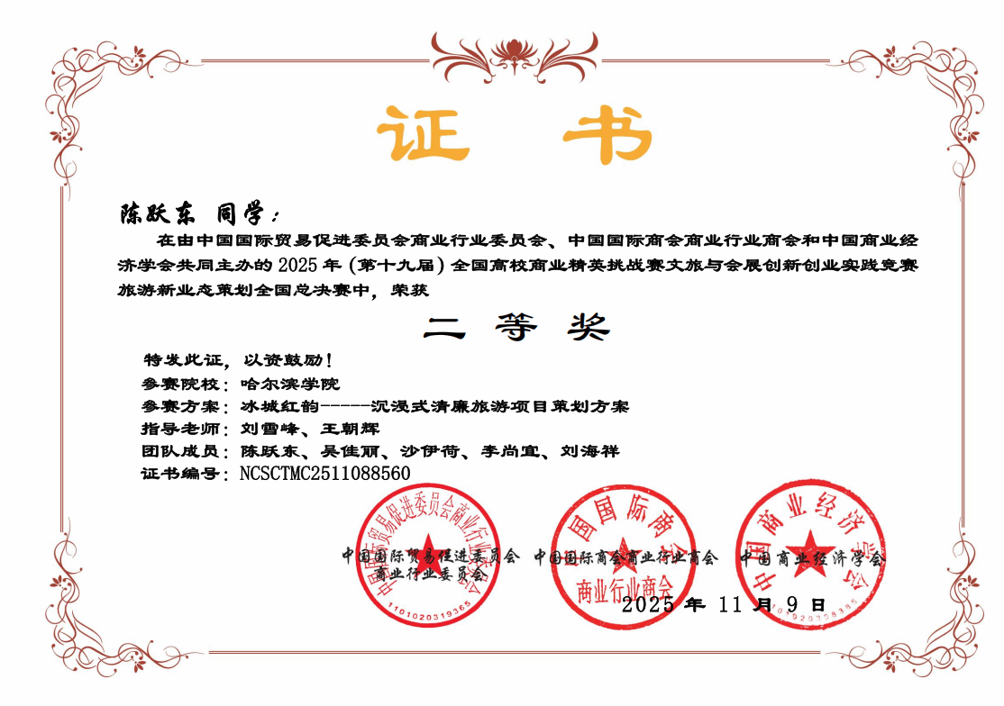 (文/魏巍)近日,2025年全国高校商业精英挑战赛文旅与会展创新创业实践竞赛圆满落幕,刘雪峰老师指导的陈跃东、吴佳丽、沙伊荷、李尚宜、刘海祥团队,在“旅游新业态策划”赛道中凭借作品《冰城红韵——沉浸式清廉旅游项目策划方案》脱颖而出,荣获全国二等奖。