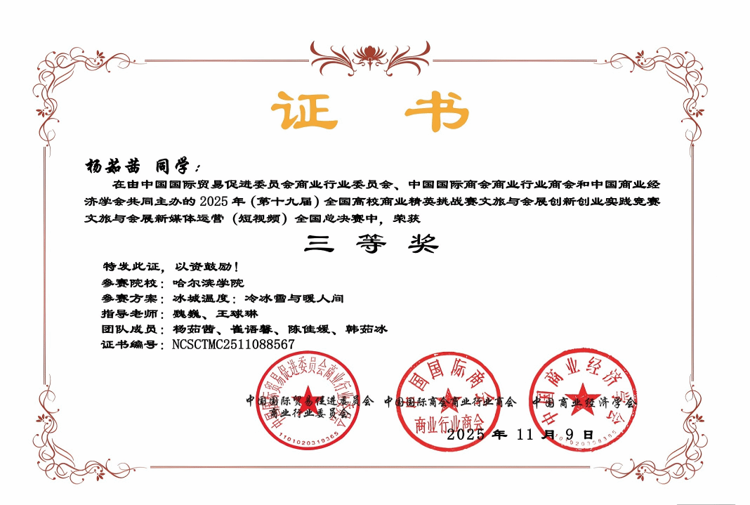 魏巍、王球琳两位老师指导的杨茹茜、崔语馨、陈佳媛、韩茹冰团队,则在“文旅与会展新媒体运营”赛道中凭借创意制作短视频《冰城温度:冷冰雪与暖人间》,荣获全国三等奖。