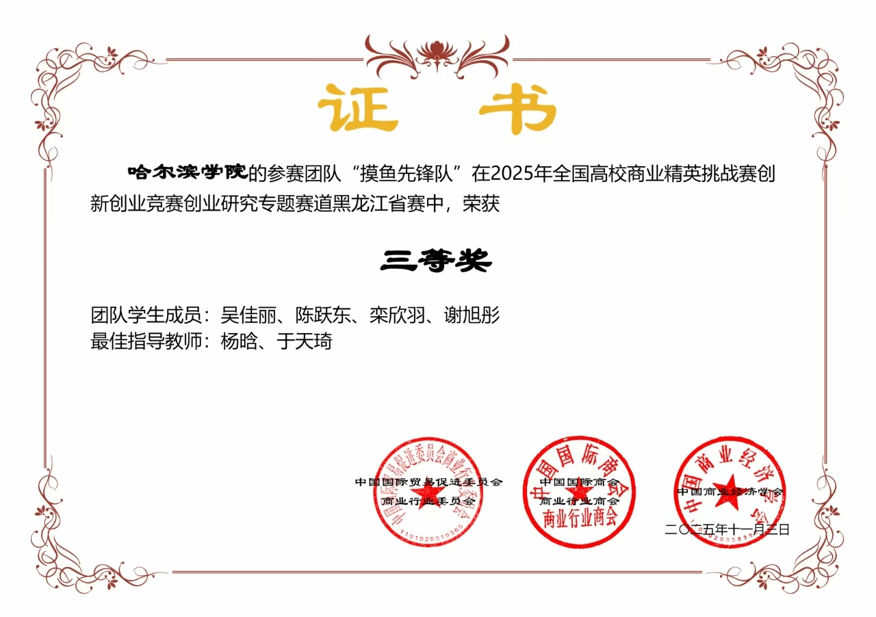 (文/于天琦)在 2025 年全国高校商业精英挑战赛创新创业竞赛黑龙江省赛的激烈角逐中,我校经济管理学院学子凭借扎实的专业积淀与前沿的创新思维脱颖而出,斩获佳绩。由王纯旭、刘佳老师指导,江南、毛丹艺、谭亚婷、孟月同学组成的团队,聚焦冰雪经济与绿色发展融合的时代命题,以作品《人本创业的算法实现 —— 基于 PSM-DID 的冰雪碳会计平台构建与实践》亮相 "创业研究专题" 赛道。作品将量化分析工具与碳会计前沿领域深度结合,通过 PSM-DID 方法构建兼具科学性与实操性的人本创业解决方案,为冰雪产业绿色转型提供了创新思路,最终荣获省级二等奖。