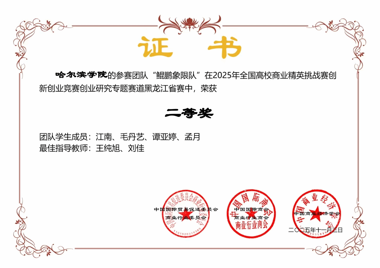 (文/于天琦)在 2025 年全国高校商业精英挑战赛创新创业竞赛黑龙江省赛的激烈角逐中,我校经济管理学院学子凭借扎实的专业积淀与前沿的创新思维脱颖而出,斩获佳绩。由王纯旭、刘佳老师指导,江南、毛丹艺、谭亚婷、孟月同学组成的团队,聚焦冰雪经济与绿色发展融合的时代命题,以作品《人本创业的算法实现 —— 基于 PSM-DID 的冰雪碳会计平台构建与实践》亮相 "创业研究专题" 赛道。作品将量化分析工具与碳会计前沿领域深度结合,通过 PSM-DID 方法构建兼具科学性与实操性的人本创业解决方案,为冰雪产业绿色转型提供了创新思路,最终荣获省级二等奖。