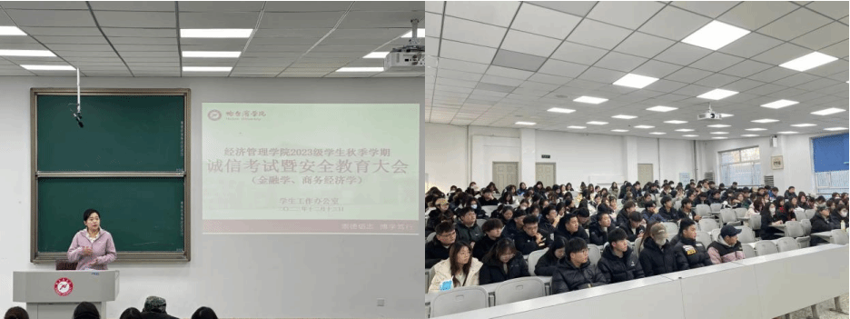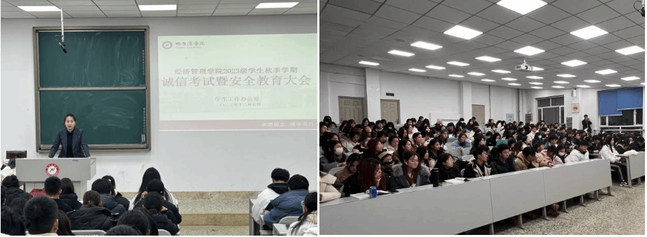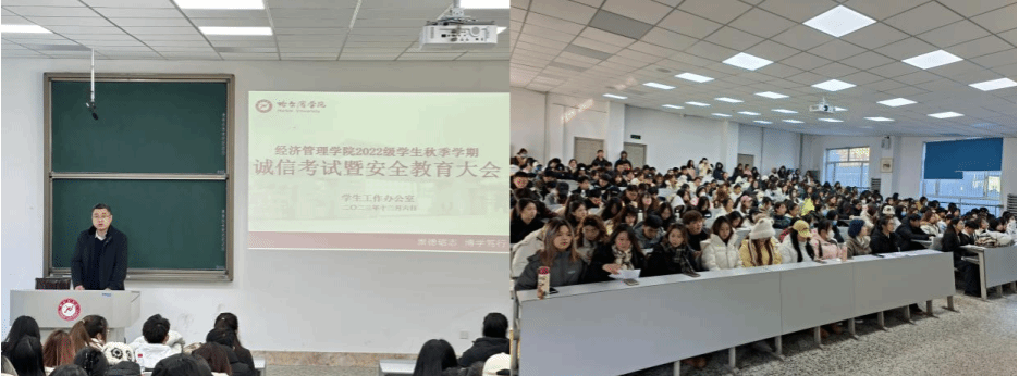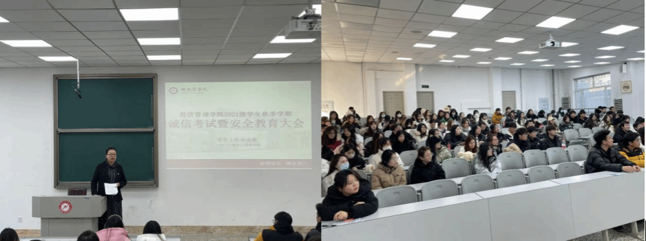 (文/高晶)为进一步规范考试秩序,严肃考风考纪,深入推进学院学风建设,切实增强学生的诚信理念,营造积极向上的考试环境,同时提高学生的安全防范意识,保障学生假期安全。2023年12月6日至13日,经济管理学院各年级辅导员分别在8101阶梯教室召开了全体学生的诚信考试暨安全教育大会。