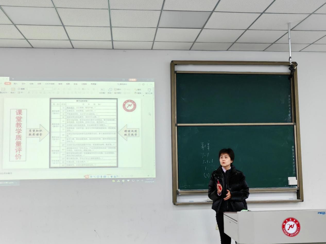 校督导徐亿军老师重点就课堂教学质量评价进行了解读,对学院教师教学质量给予了肯定,对审核评估线上听课看课进行了对标对表分析,她指出,教师应该尊重知识,敬畏课堂,持续改进,规范教学。她还对学校2024届毕业论文专项检查存在的问题进行了通报。